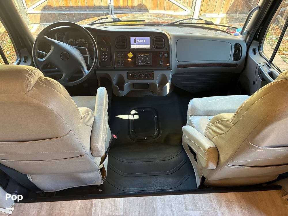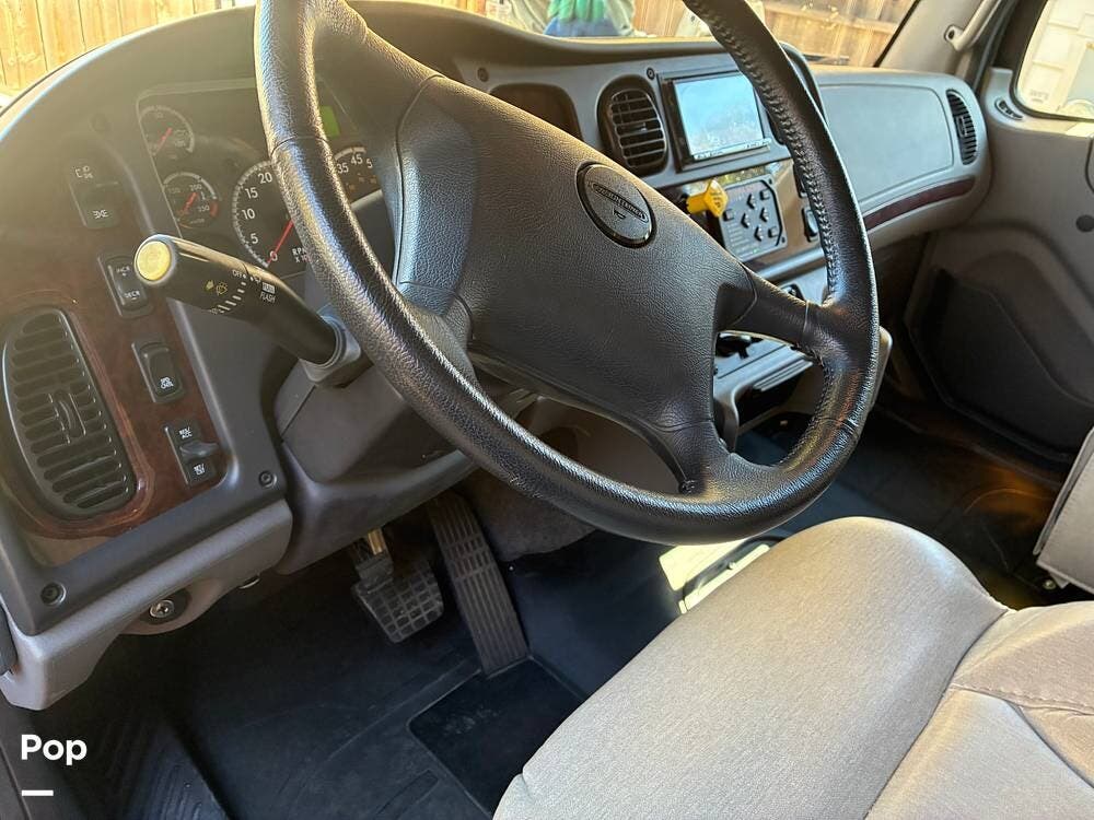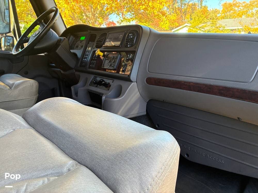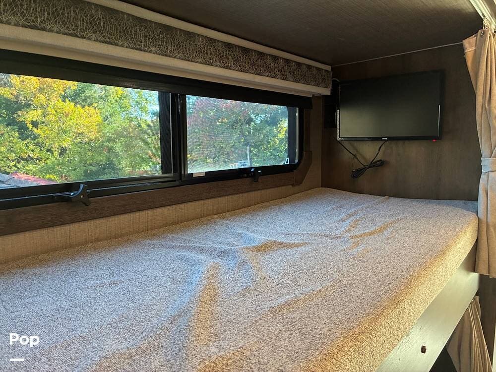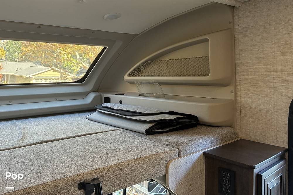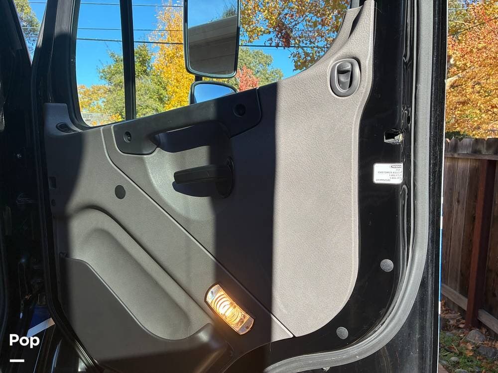 The cab area is designed for comfort on long trips, featuring plush captain's chairs, a panoramic front window, and a full suite of driving conveniences including backup and side-view cameras. Above the cab sits a spacious overhead bunk, providing a versatile sleeping or lounging area ideal for guests or family.