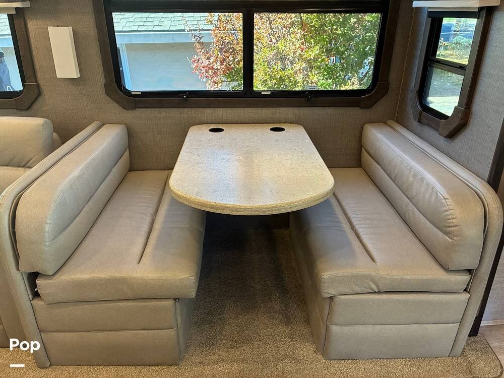 Stepping back into the main living area, the hide-a-bed sofa and convertible dinette create a welcoming space to relax or entertain, surrounded by rich cabinetry and modern finishes. The large slide-outs expand the living room dramatically, giving the interior a wide-open feel that's rare in a motorhome of this size.