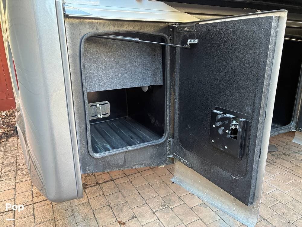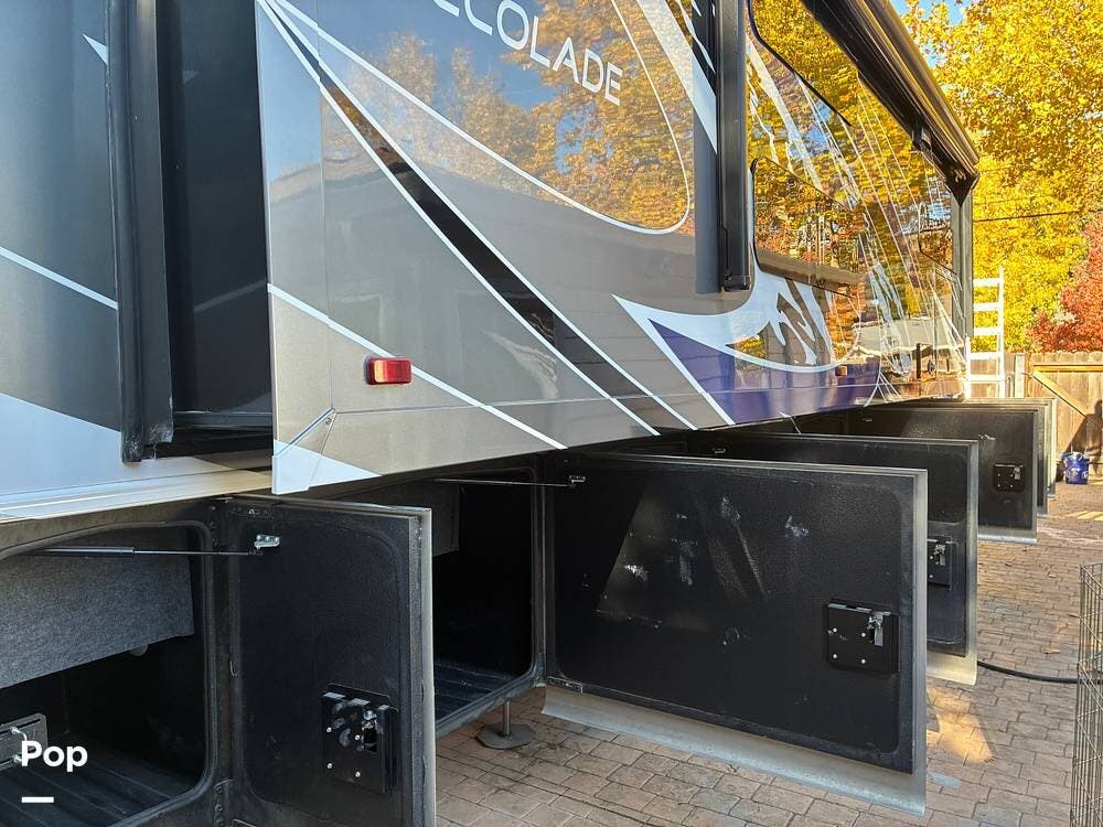 Outside, the Accolade 37L continues to impress with full-body paint, a one-piece fiberglass roof, dual-pane windows, an exterior entertainment center, and an electric patio awning with LED lighting. The pass-through basement storage compartments provide generous room for gear, while automatic hydraulic leveling jacks make setup quick and easy. A 100-gallon fuel tank and a 12,000-pound-rated hitch add to its long-haul capability.
