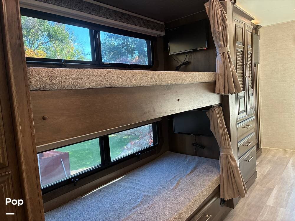 Mid-coach, a set of bunk beds with individual TVs, makes this floorplan especially family-friendly. The bunks are enclosed in their own zone for privacy and convenience, making them perfect for kids or guests. The full bath features a spacious fiberglass shower with a glass door, a porcelain toilet, and a solid-surface vanity with plenty of storage.