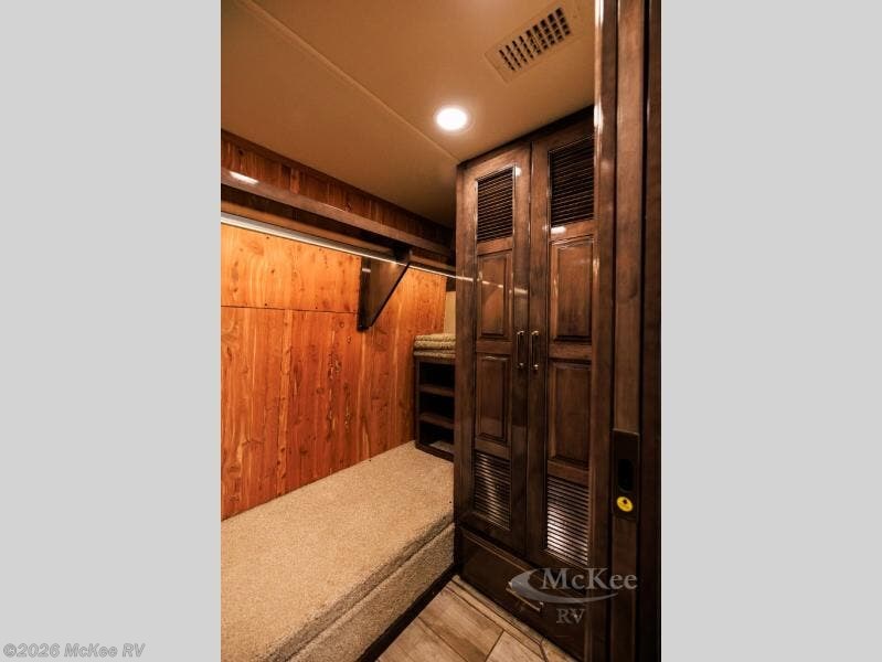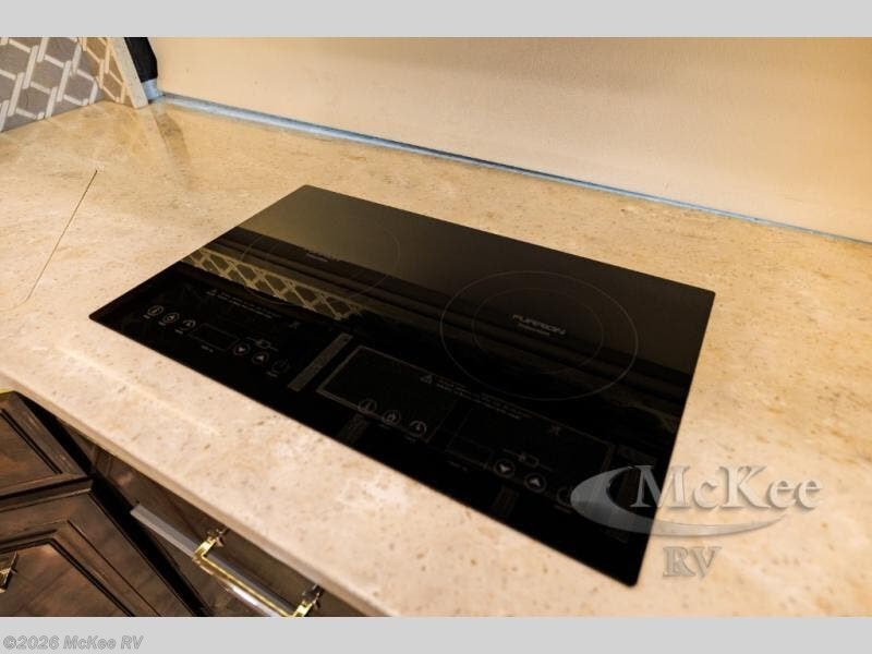 No worries about storage for all your clothes in this coach with the large cedar-lined wardrobe with a motion activated LED light which includes cabinets and a washer/dryer within the wardrobe. And you will have easy access through the full bathroom connected to the master bedroom. The space savings doors give you more floor space as well as the slide outs that are within the bedroom and bathroom. The Select Comfort Sleep Number king-sized mattress, the nightstands with USB ports to keep your electronics charged, and the vanity and dresser allow you to retreat in comfort each night. The induction cooktop, the convection microwave, the slide out storage tray in the overhead cabinet, and the dishwasher drawer will allow the chef to make meals and keep everything clean just like at home. And you will find the sofa with ottomans, the hide-a-bed sofa and the two captain's chairs offers a place to relax, visit and watch the 50" Smart TV on a lift or the 32" Smart TV over the cab. You will also find a 43" Smart TV outside while you relax under the dual awnings.