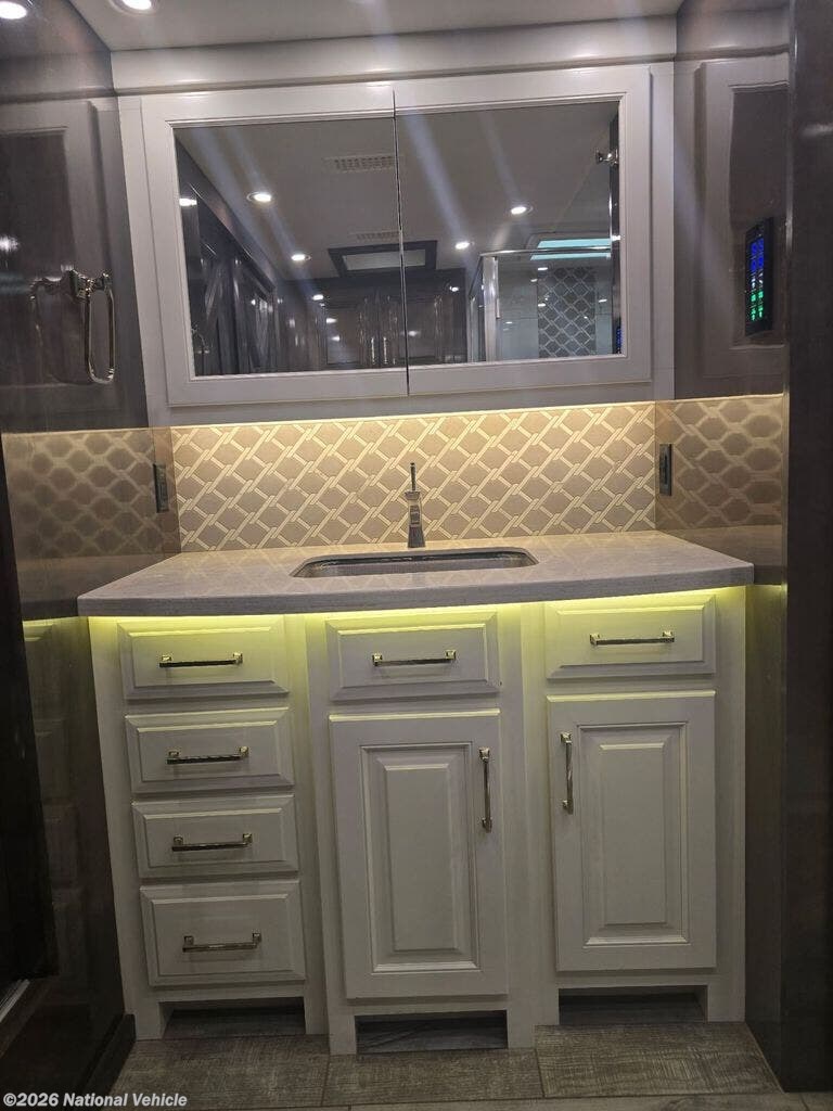 You and your spouse will enjoy traveling in this coach for many reasons, yet the master suite might become one of your favorite spaces. From the Select Comfort Sleep Number king-sized mattress, the nightstands with USB ports and solid surface tops to charge your cell phone, plus the vanity and dresser to the 32" LED slim Smart HDTV to watch before bedtime, this cozy area offers comfort and space with two slides. As you enter the rear bathroom through the bedroom you can wash some linens, get cleaned up in the 33" x 41" shower and grab your clothes from the wardrobe. The half bath is mid-coach and will come in handy when you have guests. You can whip up a warm meal using the induction cooktop or a convection microwave and dine at the dinette table with swivel seats, the sofa with ottomans, the hide-a-bed sofa or on the captain's chairs.