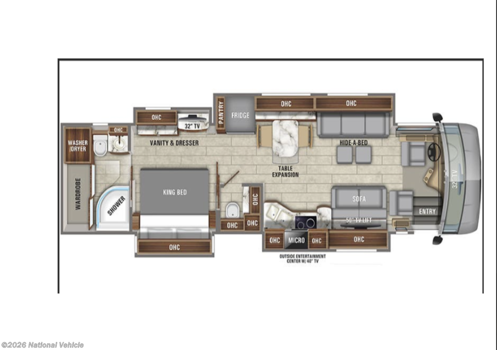 Sleeping Layout: Typically, 8?10 guests depending on configuration, with options for a booth dinette, theater seats, or hide-a-bed sofa