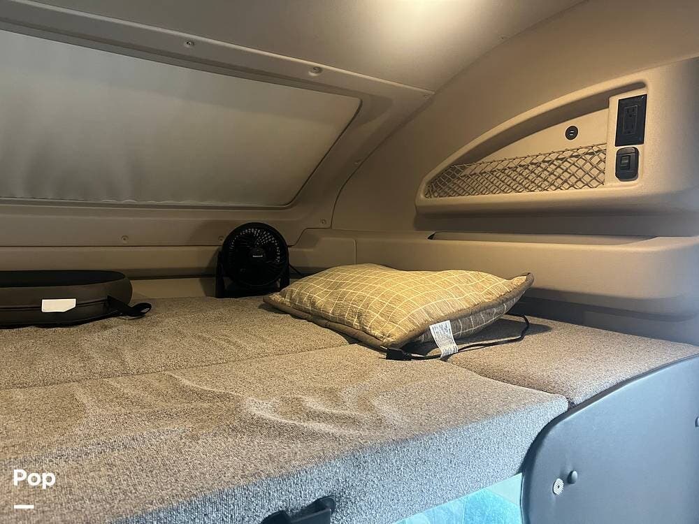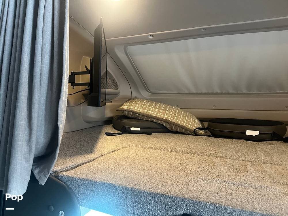 As you enter the Odyssey 31F, you'll see the large cab over the camper, with a viewing window above the driver/ passenger seat and a flat-screen TV.
