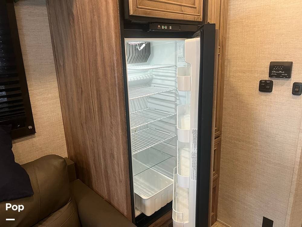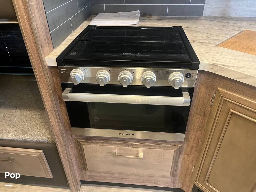Across from the entrance is the large slide with a dinette and kitchen area. Here, you'll see a double sink, 3-burner stove, microwave, and oven. Across from it is the large fridge/ freezer.