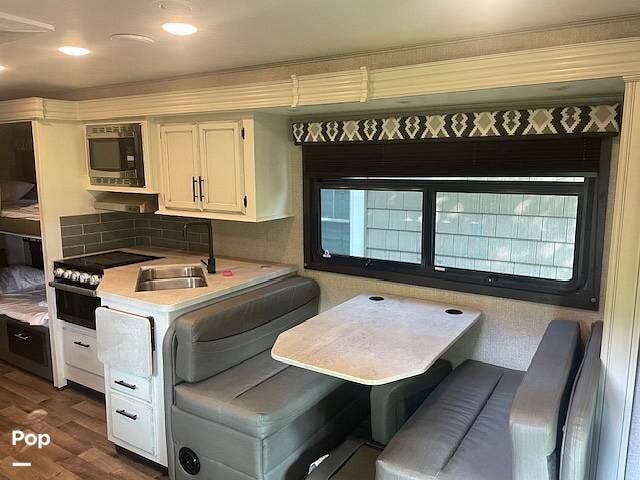 Next to the kitchen, you will find a booth-style dinette that easily accommodates four adults for meals and also converts into a sleeping area.
