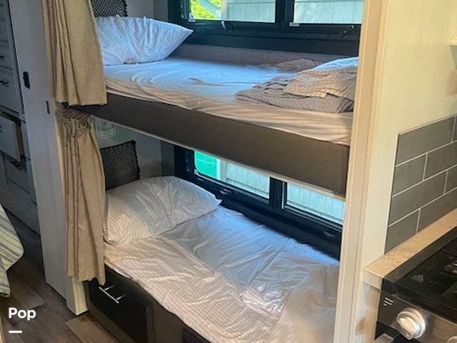 The master bedroom features a queen-size bed and ample storage space. There is also the bonus of the bunk bed area, which will sleep two more of your guests. There is a very nice-sized full bathroom with a stand-up shower.