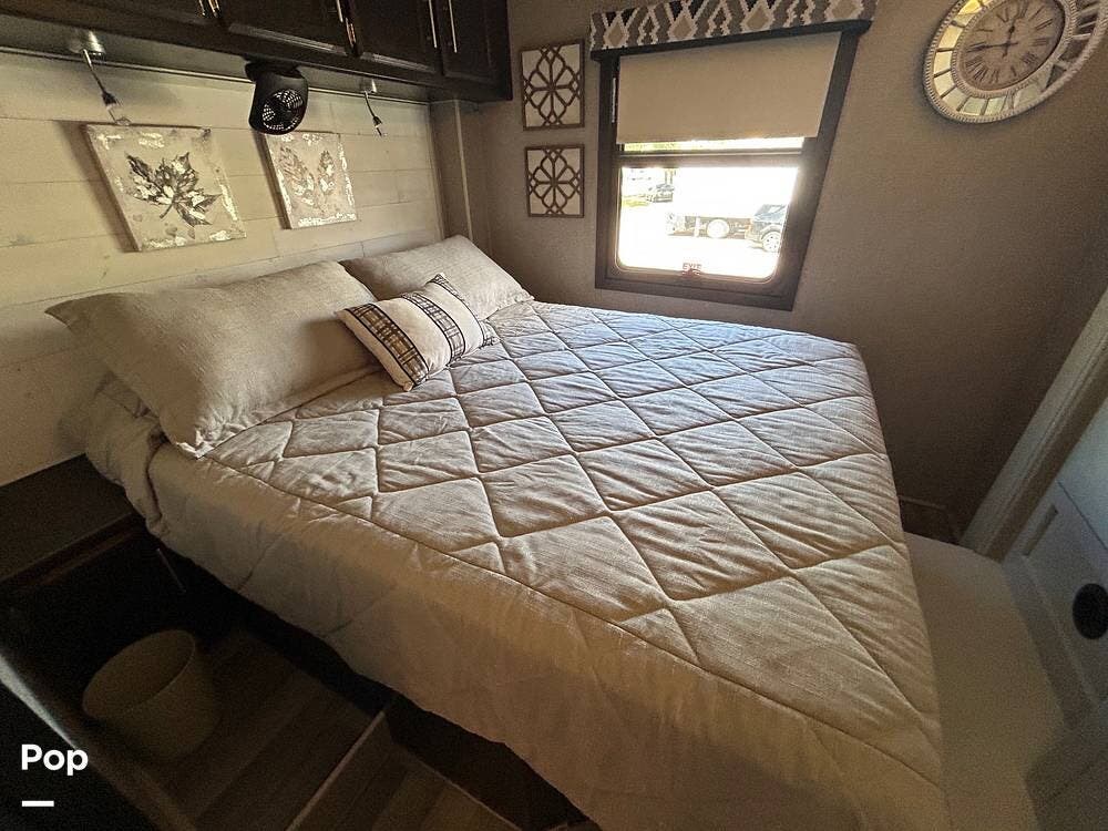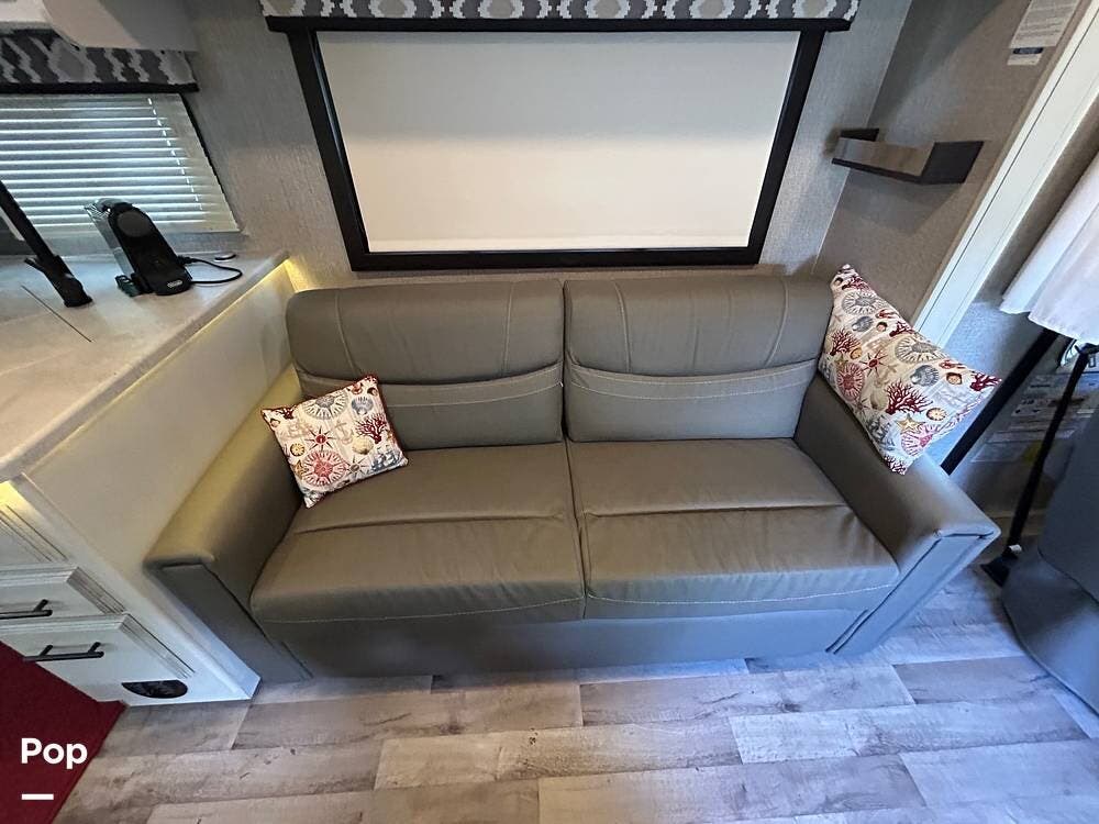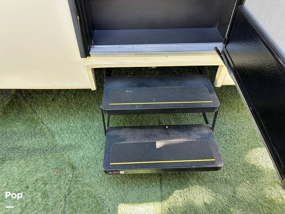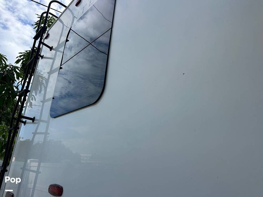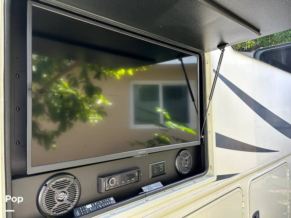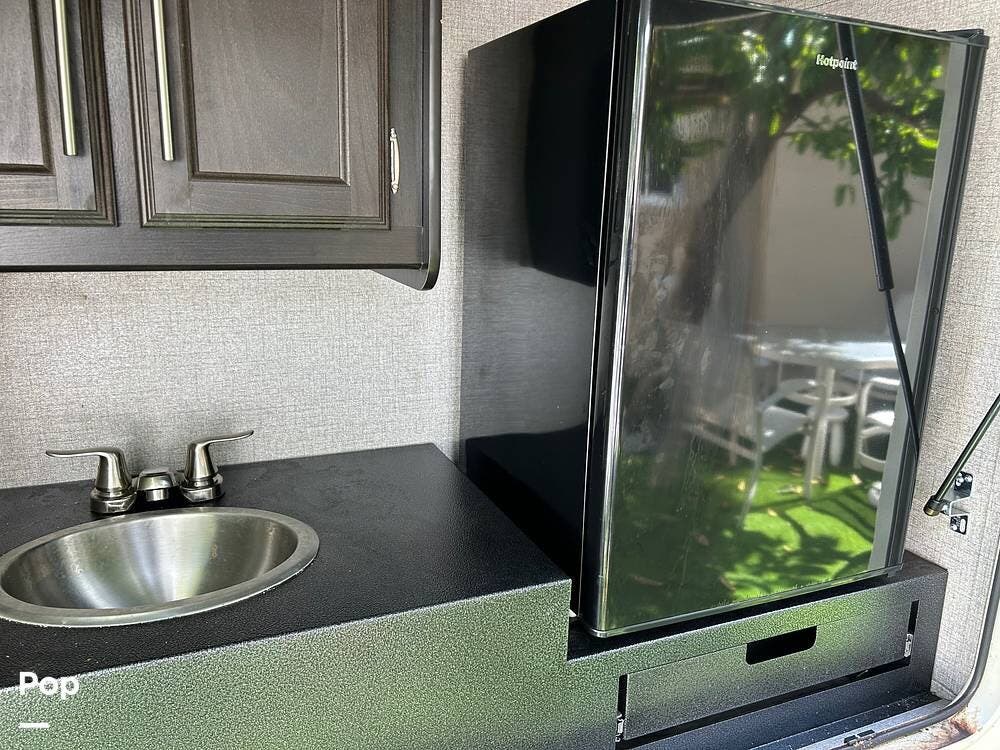 Measuring approximately 31'4" in length with an 18,000 lb GVWR, it comfortably sleeps up to 7-10 people thanks to its full-wall slide, queen bed, convertible dinette, sofa bed, and overhead bunk. Comes with an outside kitchen and a TV with a stereo.