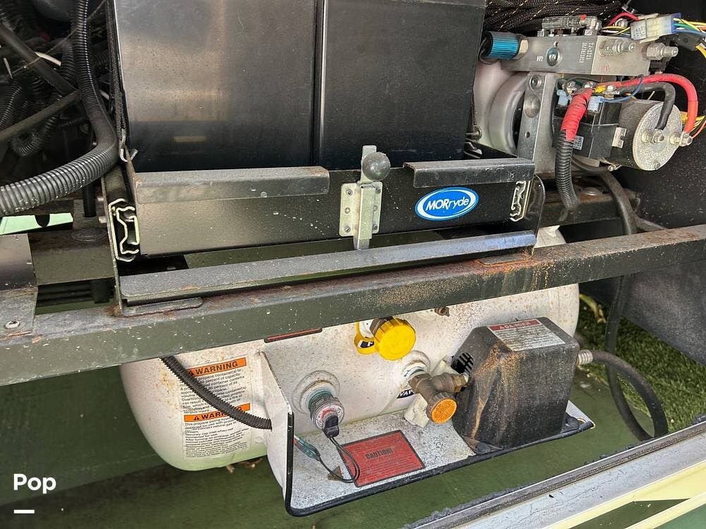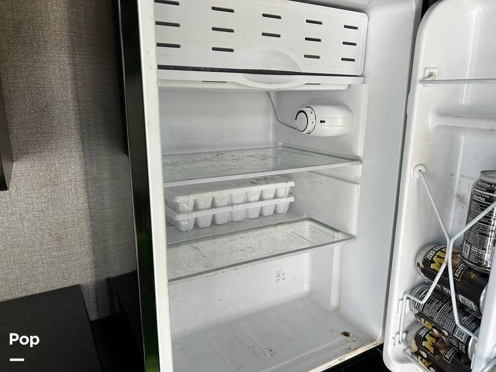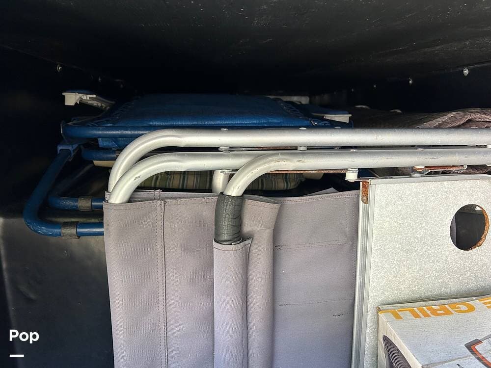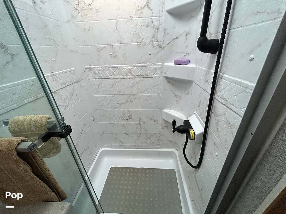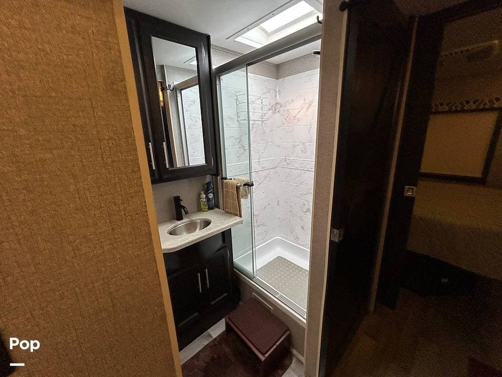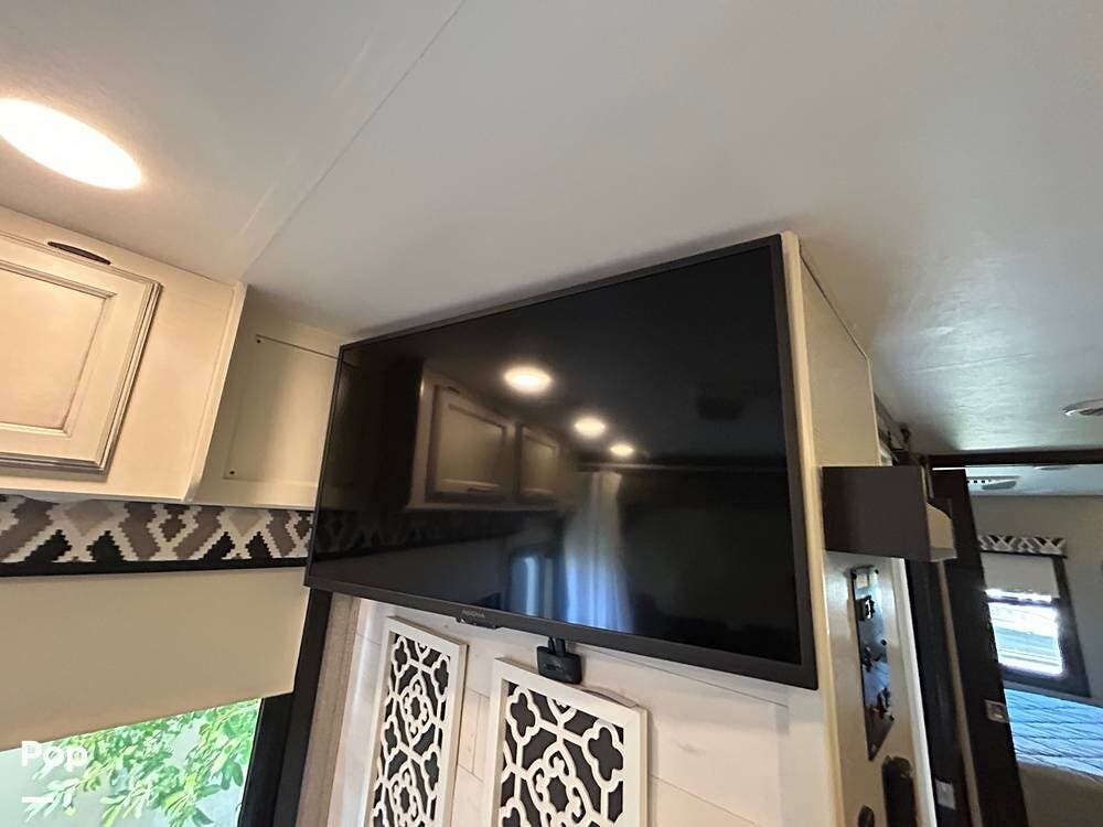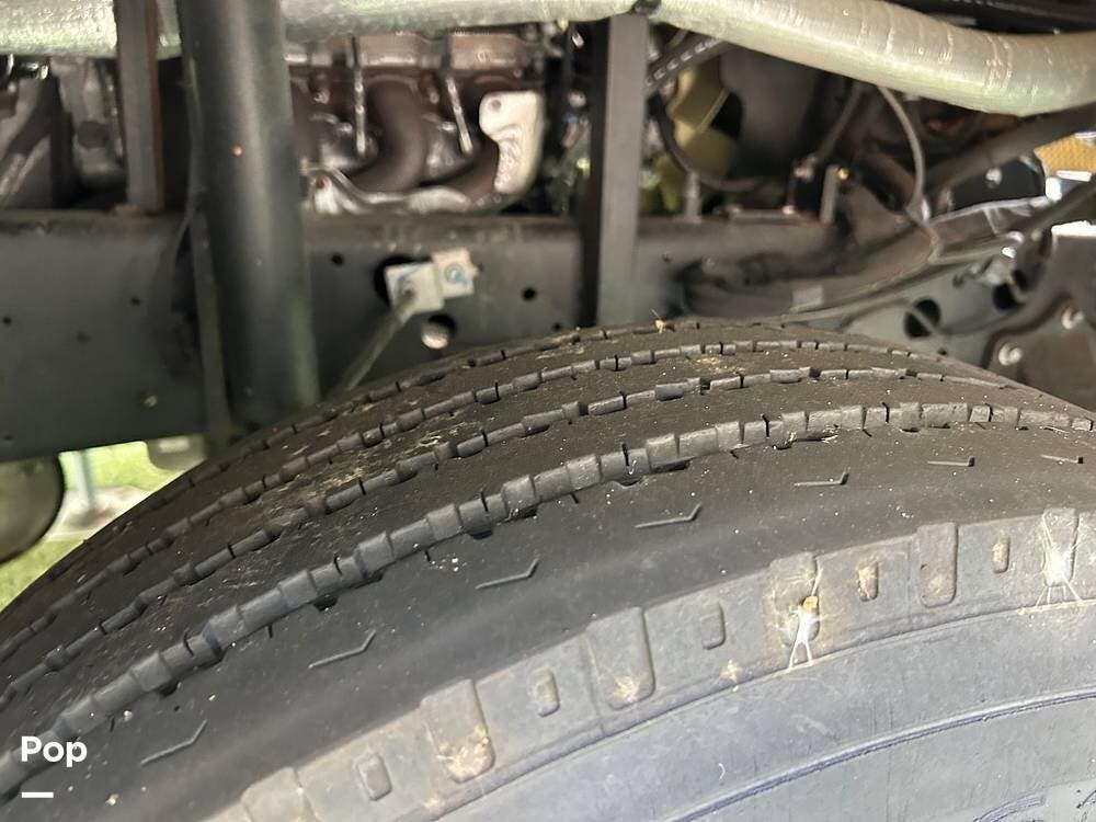 Measuring approximately 31'4" in length with an 18,000 lb GVWR, it comfortably sleeps up to 7-10 people thanks to its full-wall slide, queen bed, convertible dinette, sofa bed, and overhead bunk. Comes with an outside kitchen and a TV with a stereo.