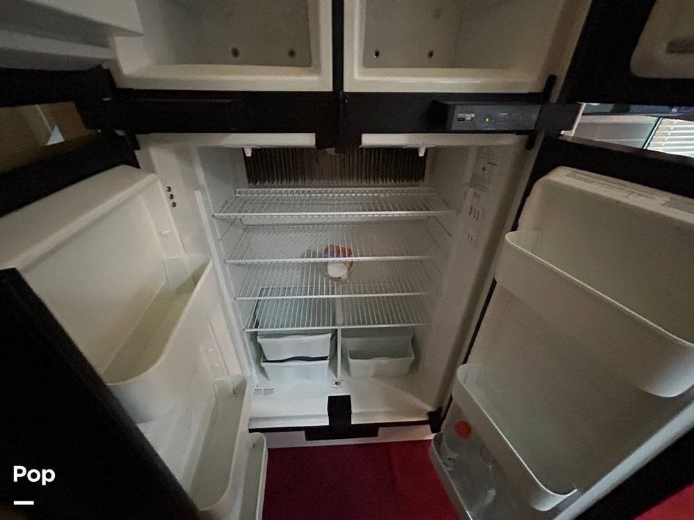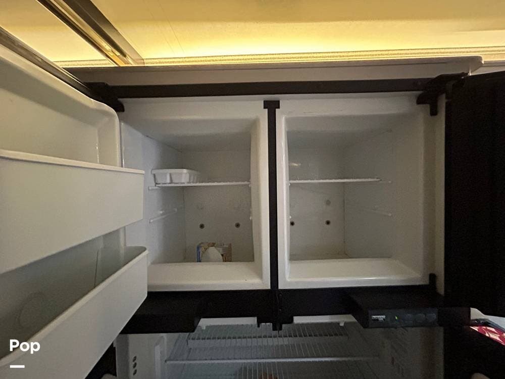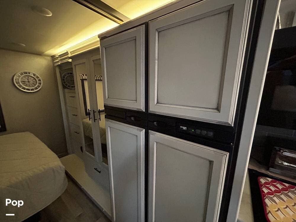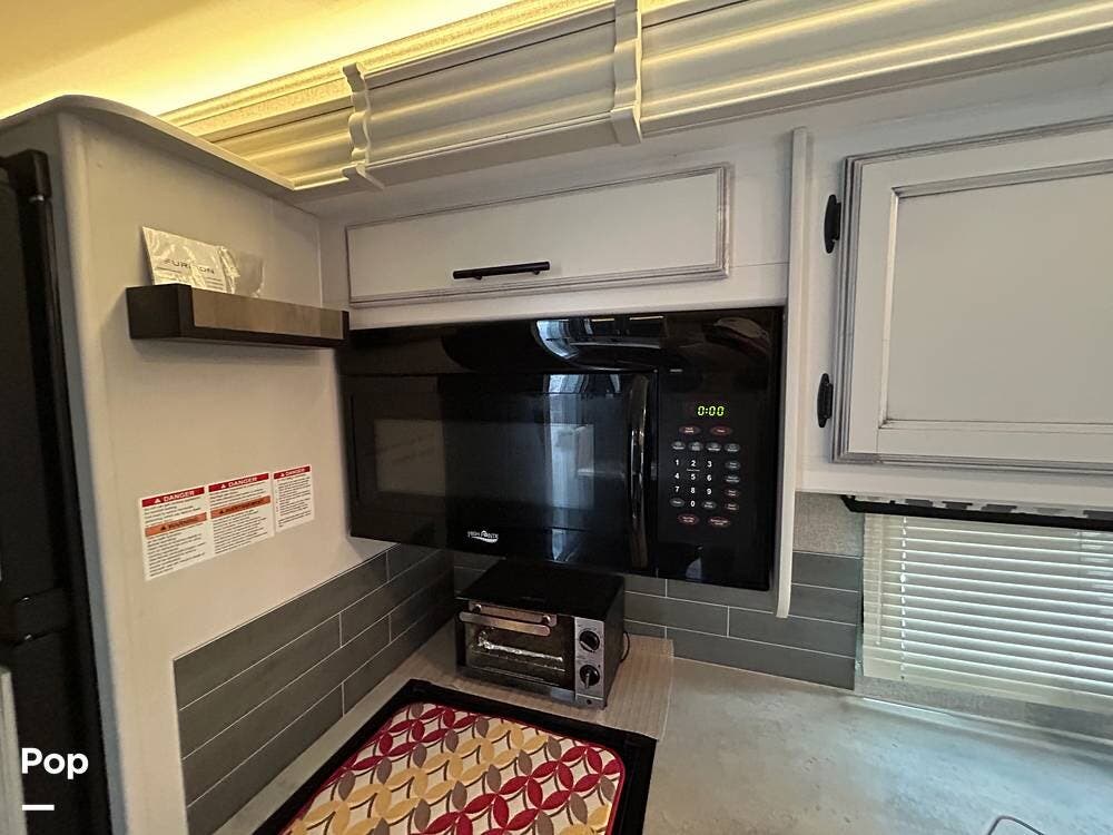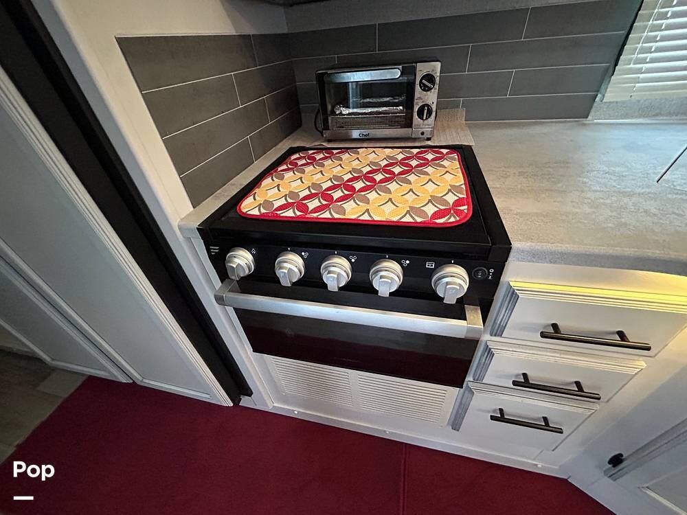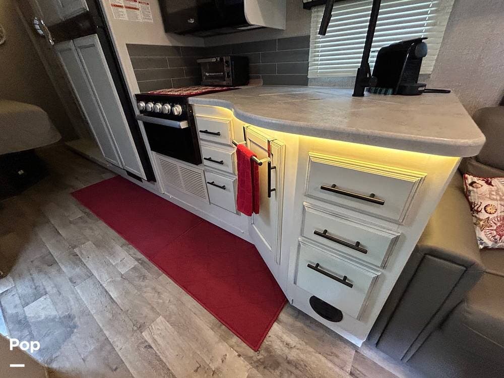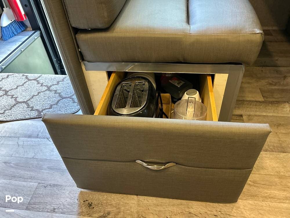 Inside, the kitchen features a residential-size microwave and a Furrion all-in-one cooktop and oven, offering all the conveniences of home. The booth dinette and sofa provide comfortable seating and dining options, complemented by swivel driver and passenger seats with a removable cockpit table for added versatility. A double-door refrigerator and pantry offer ample food storage, while the bedroom includes a wardrobe and dresser for plenty of clothing space.
