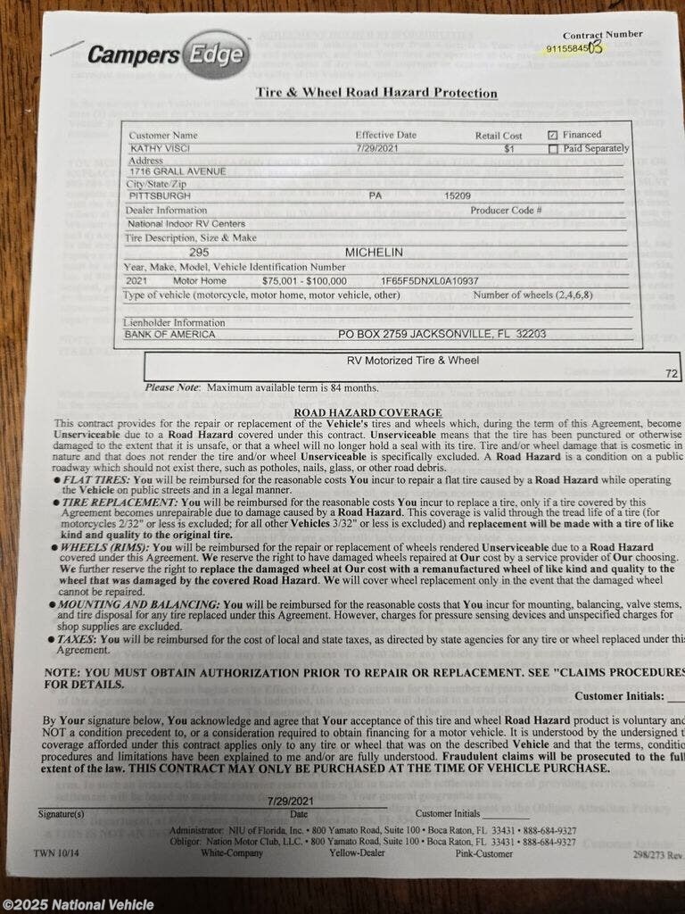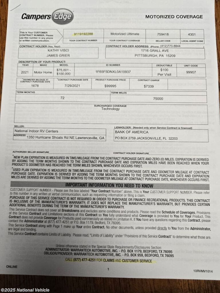 The motorized coverage is good until 7/28/2027 and is transferable for a $75 fee and the tire and wheel road hazard protection is good for 75,000 miles.