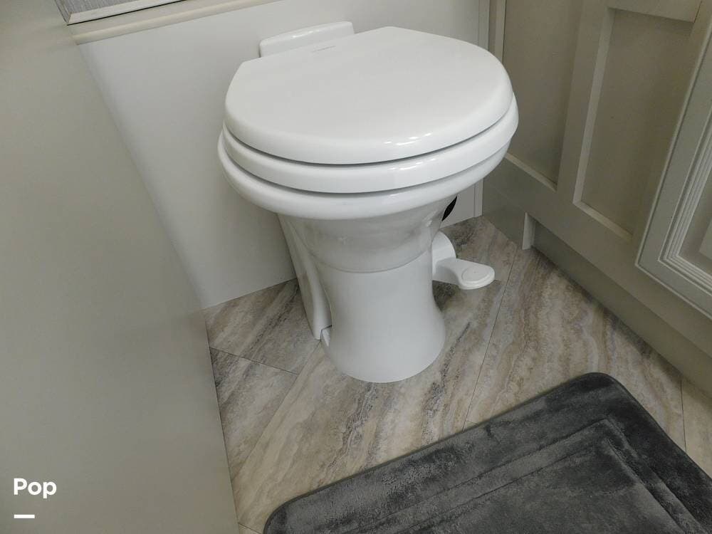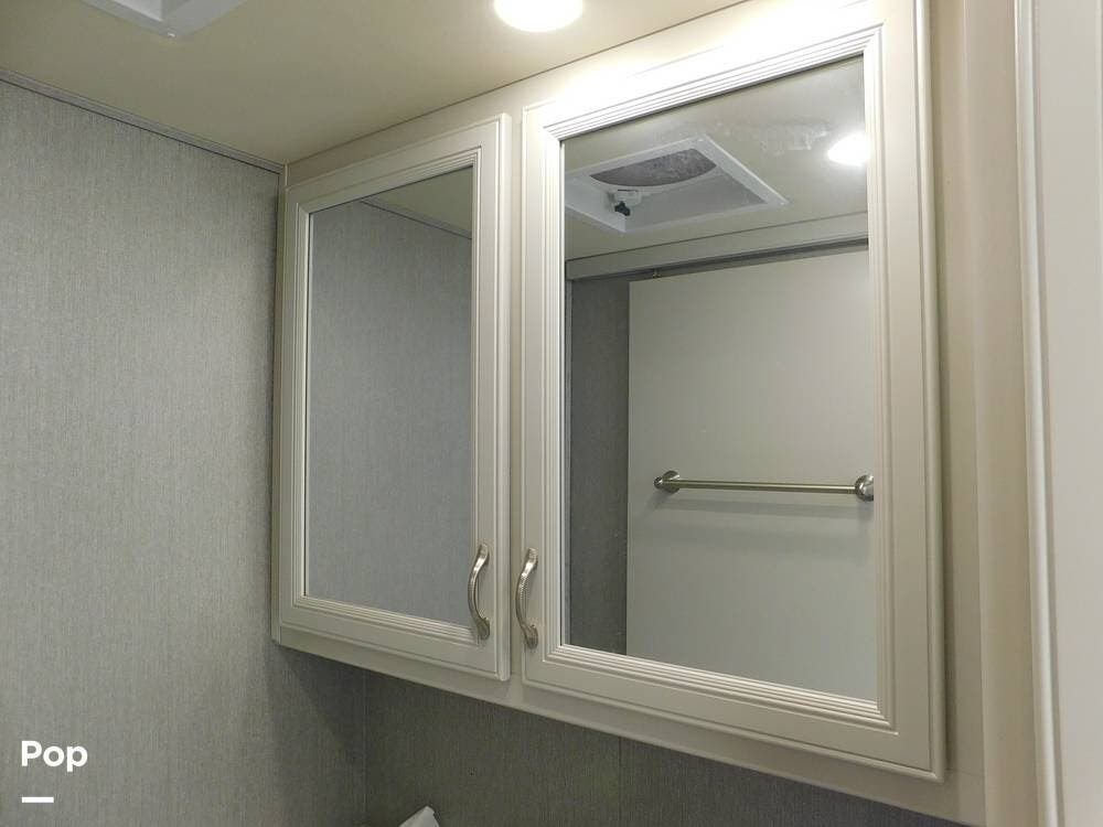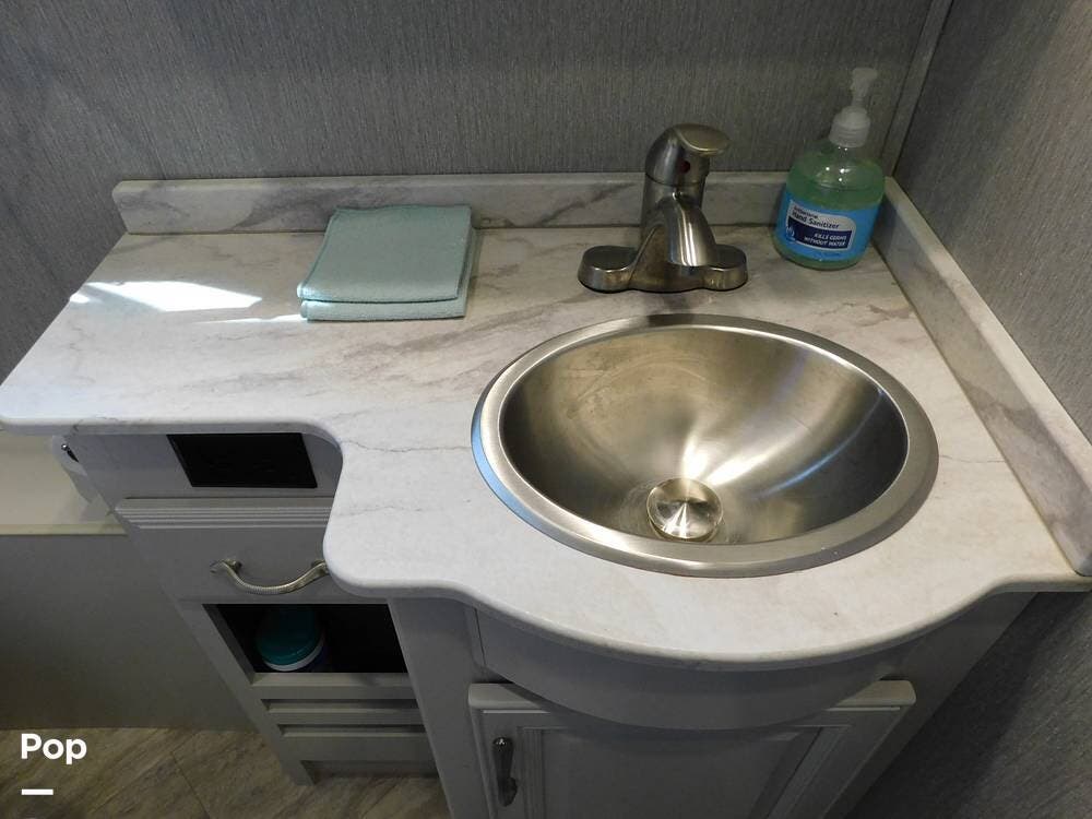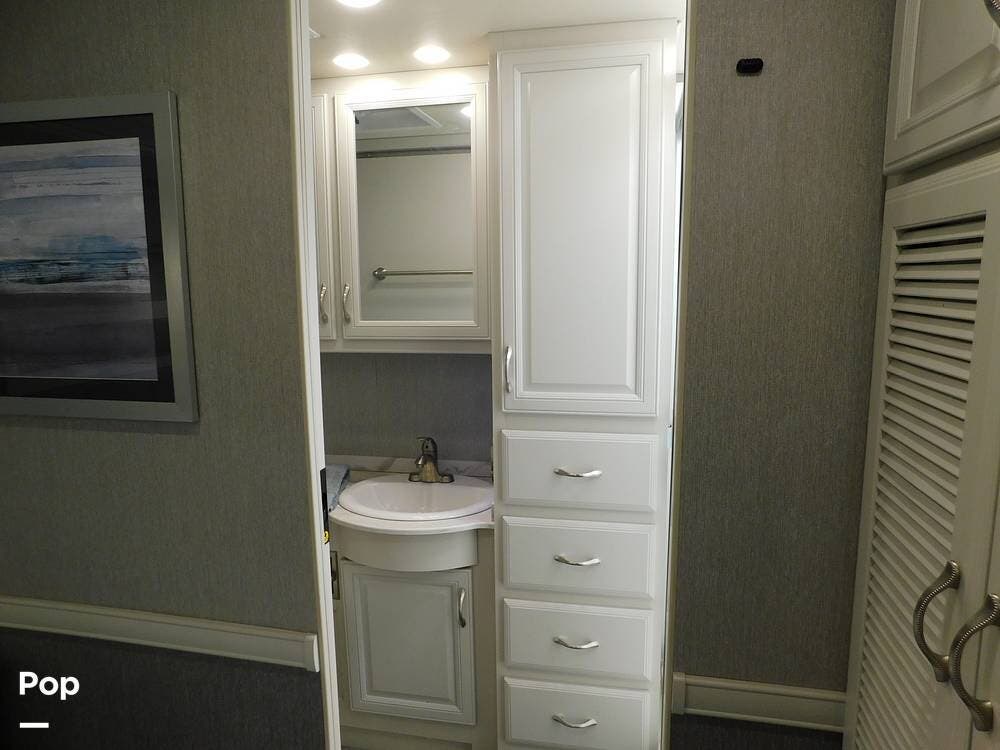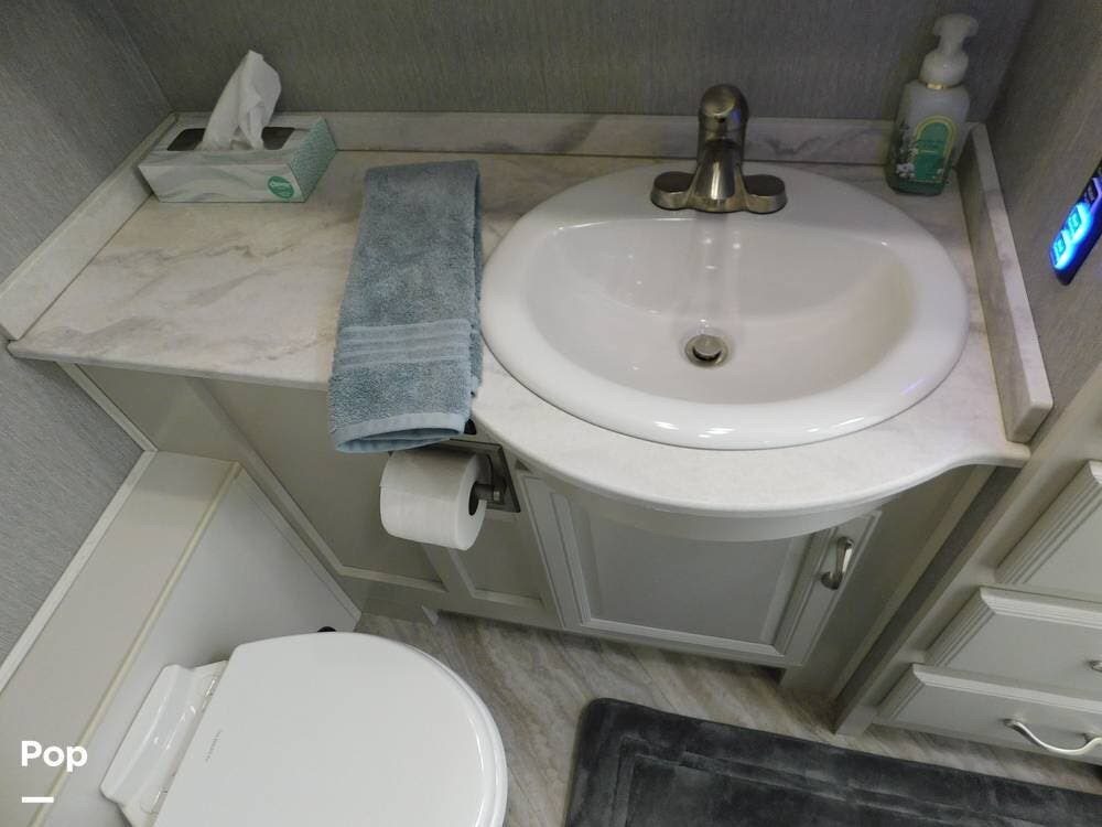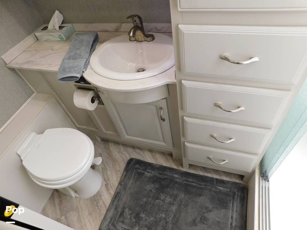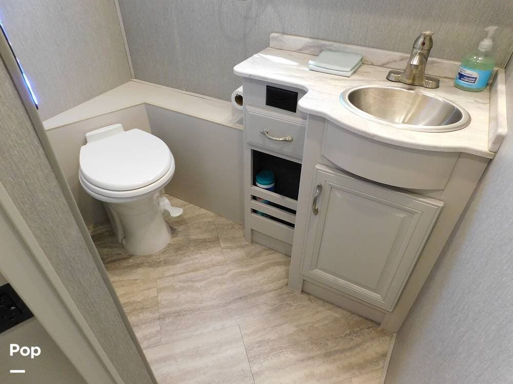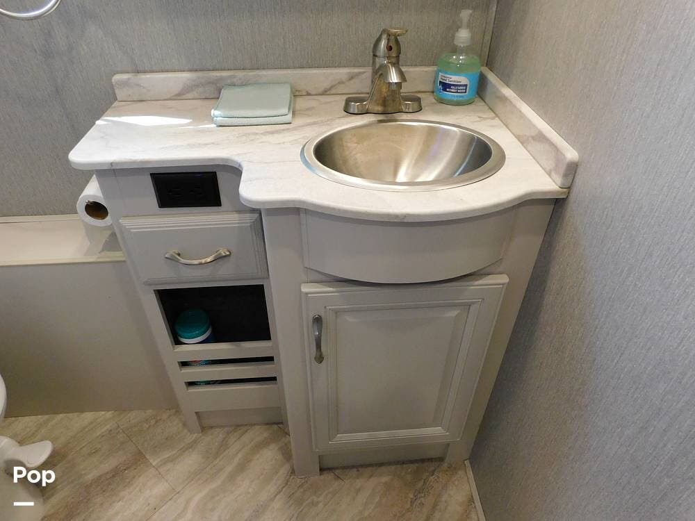 The bathroom is one of the highlights of the 35K, offering a bath-and-a-half configuration. The main bathroom at the rear includes a spacious shower with a glass door, a porcelain toilet, and a vanity with solid-surface countertops. The half bath, conveniently located mid-coach, is ideal for guests and provides quick access during travel.