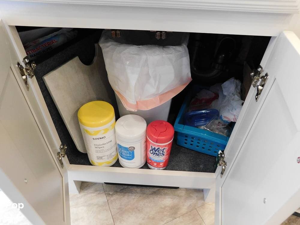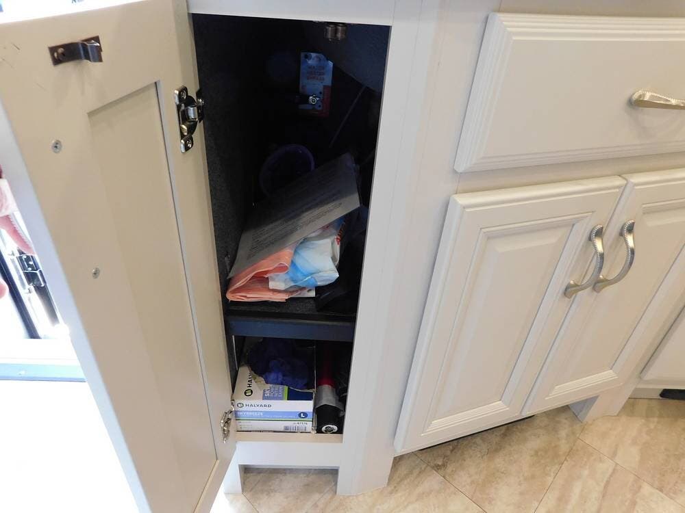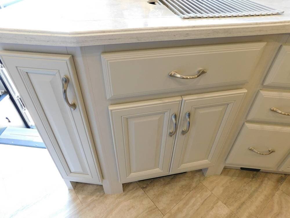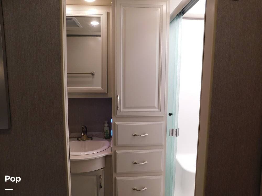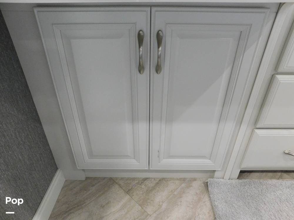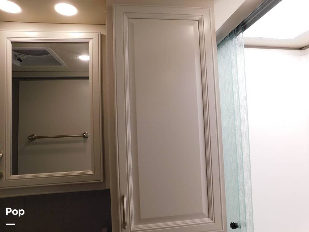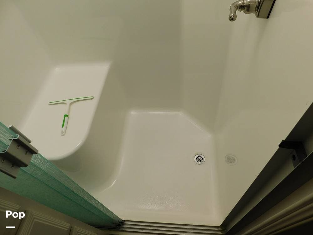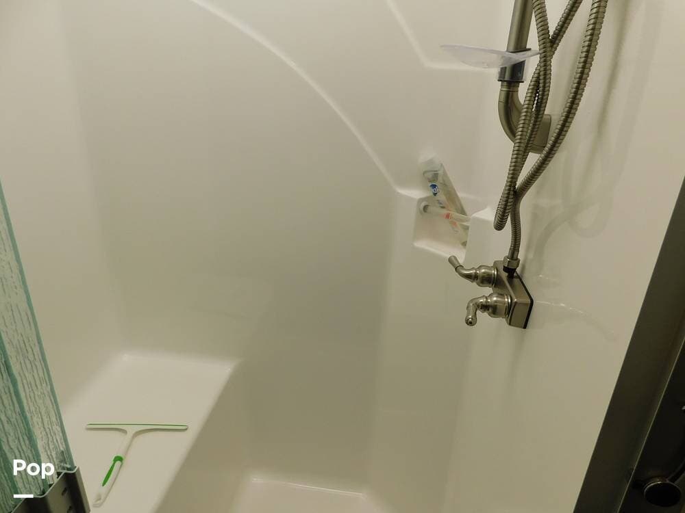 The bathroom is one of the highlights of the 35K, offering a bath-and-a-half configuration. The main bathroom at the rear includes a spacious shower with a glass door, a porcelain toilet, and a vanity with solid-surface countertops. The half bath, conveniently located mid-coach, is ideal for guests and provides quick access during travel.