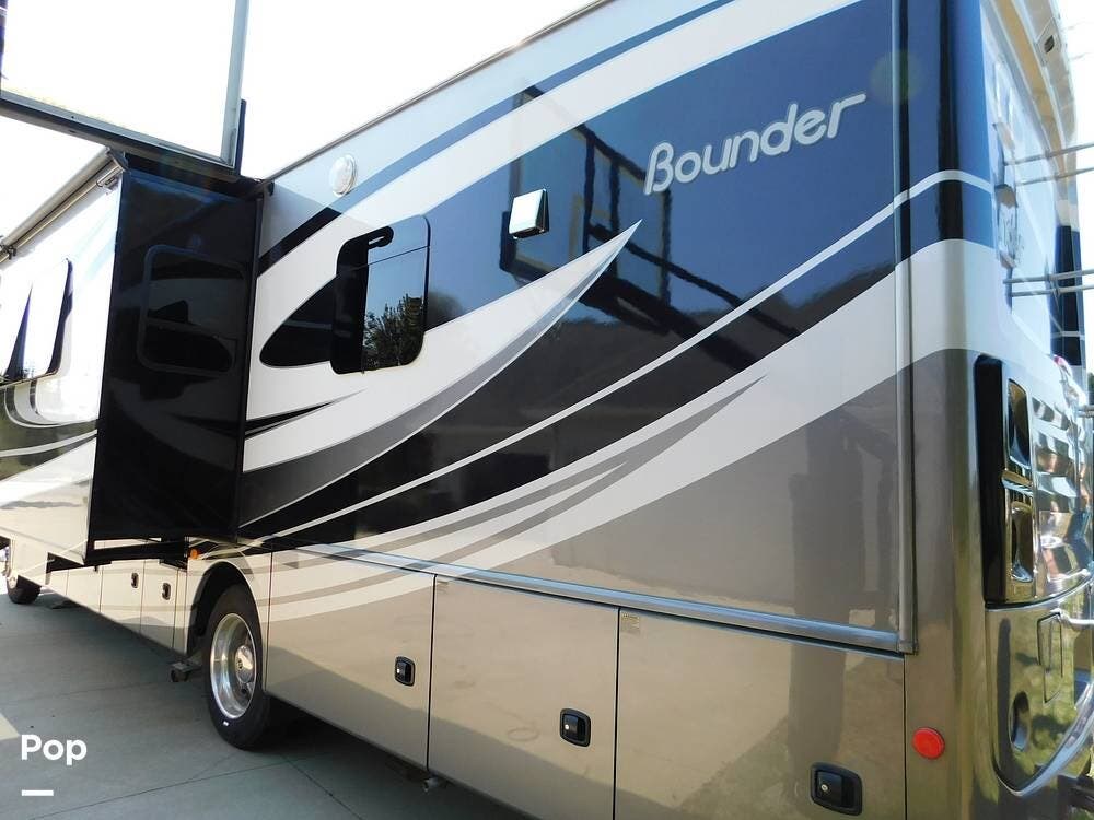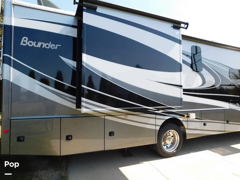 This Bounder is equipped with a powerful 7.3L V8 engine, delivering smooth performance and reliable handling on the road. The exterior showcases modern lines with full-body paint, integrated awnings, exterior TV, and ample storage compartments, making it both attractive and functional for extended trips.