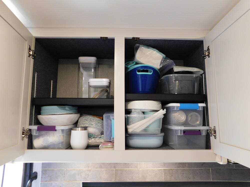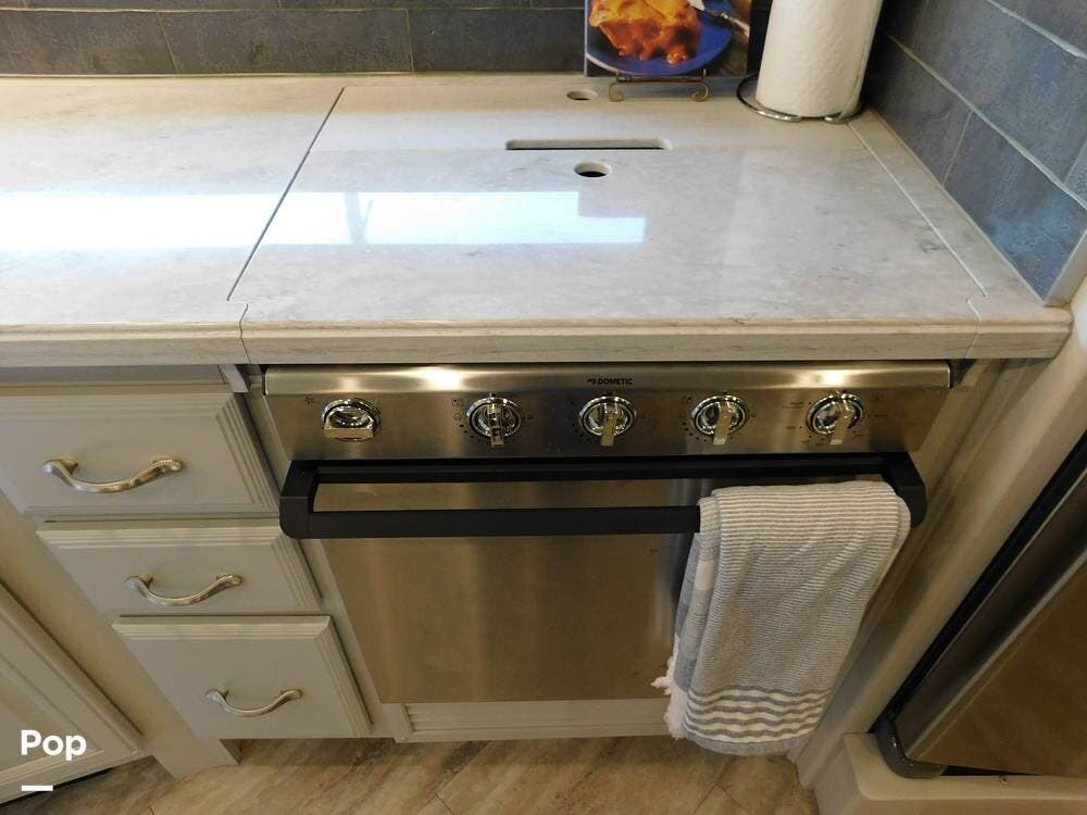 The kitchen is fully equipped with solid-surface countertops, a residential-sized refrigerator with ice maker, a convection microwave, and a three-burner cooktop with oven. Ample cabinetry and a pantry provide generous storage for food and cooking supplies.