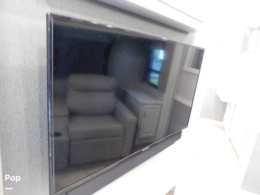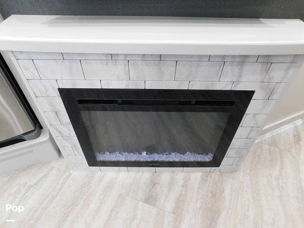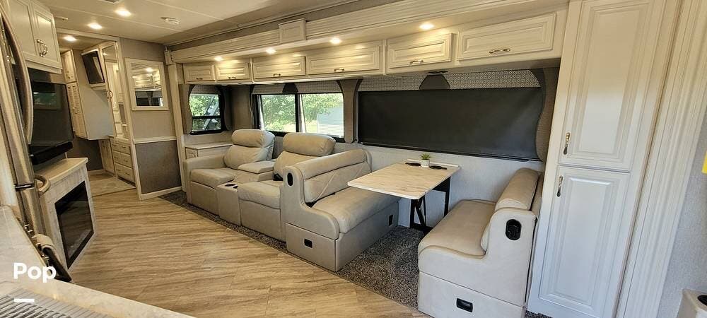 The living room features theatre seating for two, a convertible booth dinette, and a queen-size drop-down bed. A flat-screen LED TV with a fireplace below provides entertainment, perfect for relaxing evenings after a day of travel. Plus a 2nd TV forward above the cab.