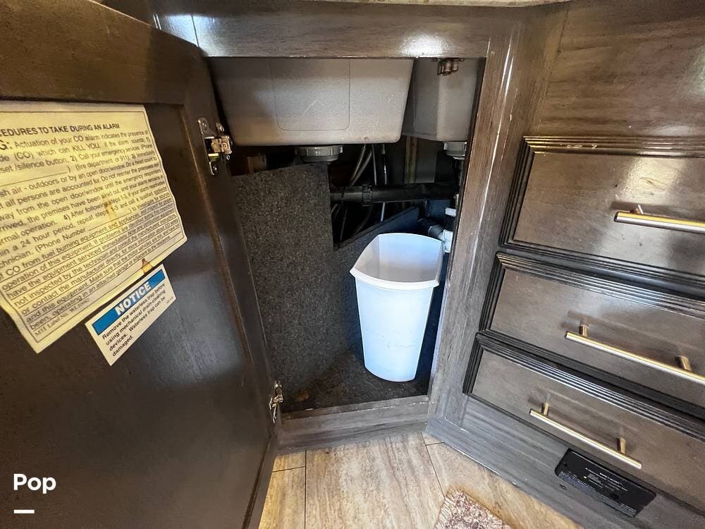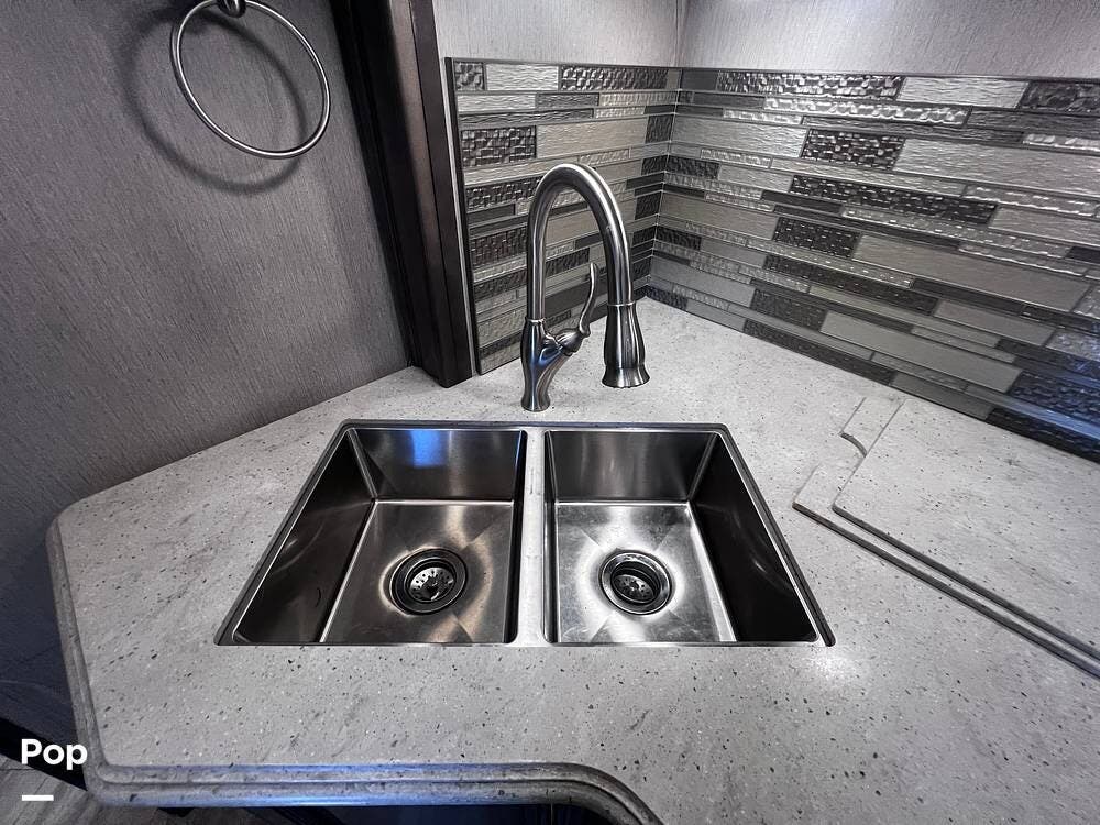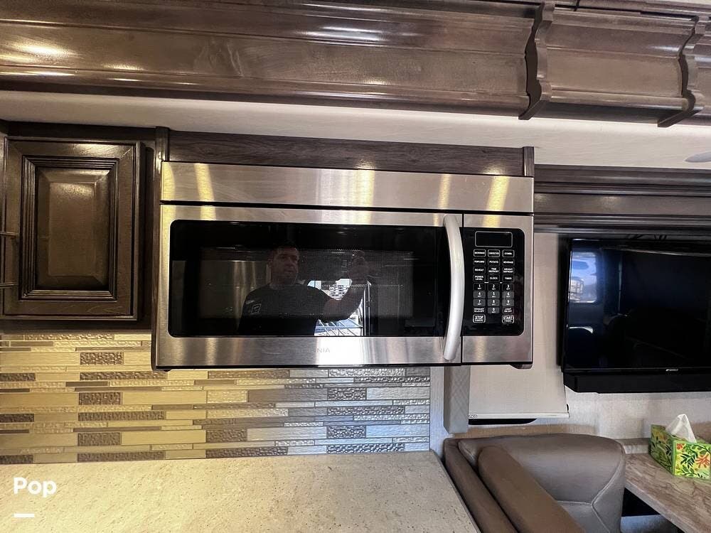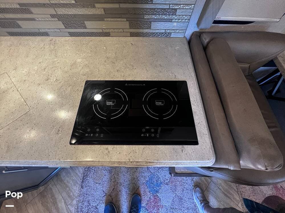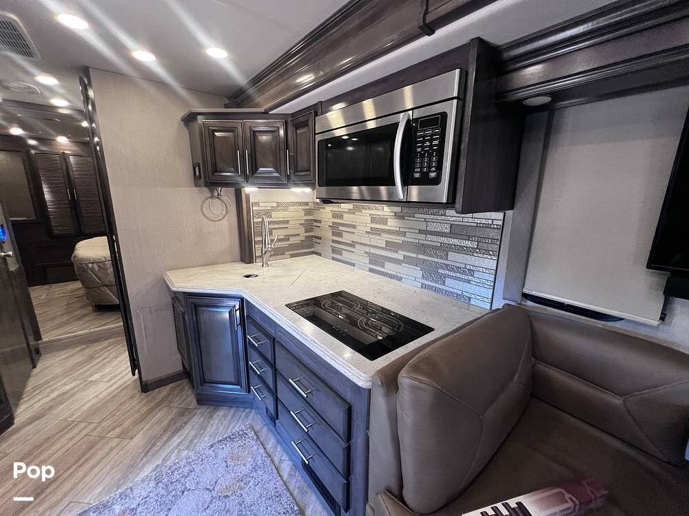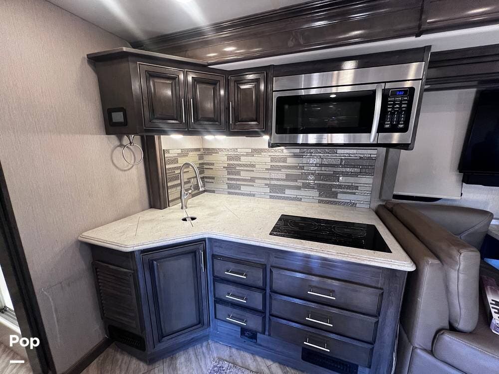 This Pace Arrow is well-equipped for full-time traveling. It features a nice kitchen area for preparing meals while traveling. You'll notice the double kitchen sink, the microwave/convection oven, and the induction stove top burners.