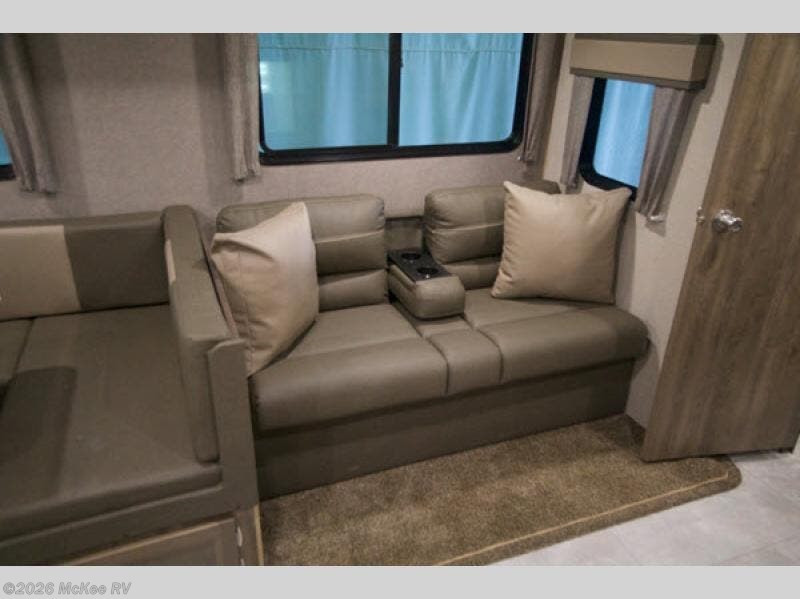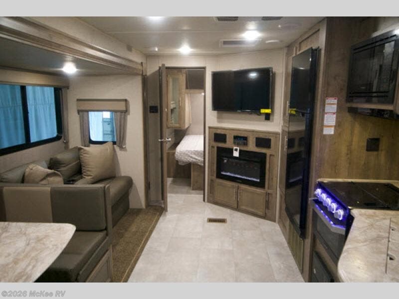 Make your way to the campground in style with this Aurora travel trailer! Everyone can easily help unload and set up camp because of the two entry doors that will allow you to create a smooth flow of traffic. Set up the 18' power awning, grab your totes from the pass-through storage, and start dinner preparations outside in the fresh air at the outdoor kitchen. Inside of the private bedroom, there is a coat closet that is right next to the second exterior entry door which is super convenient for those nights when you are outside looking at the stars and realize that you need an extra layer of warmth. You can even come back inside once you are all finished stargazing to play a round of cards at the U-shaped dinette with the rest of the night owls in your group.
