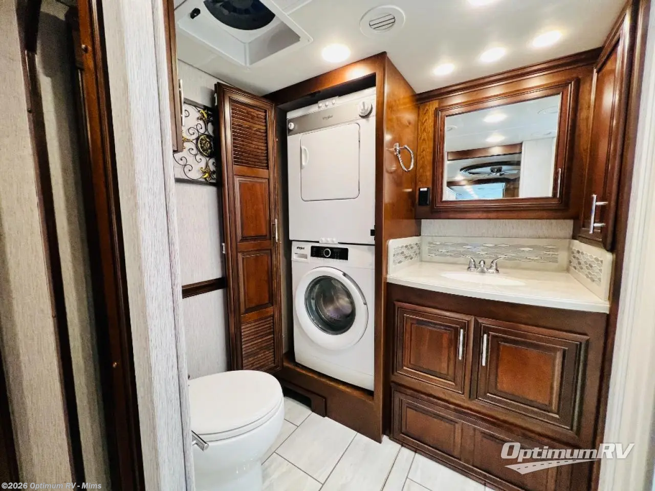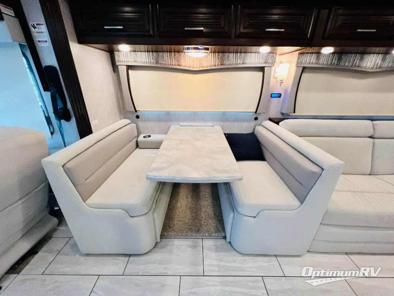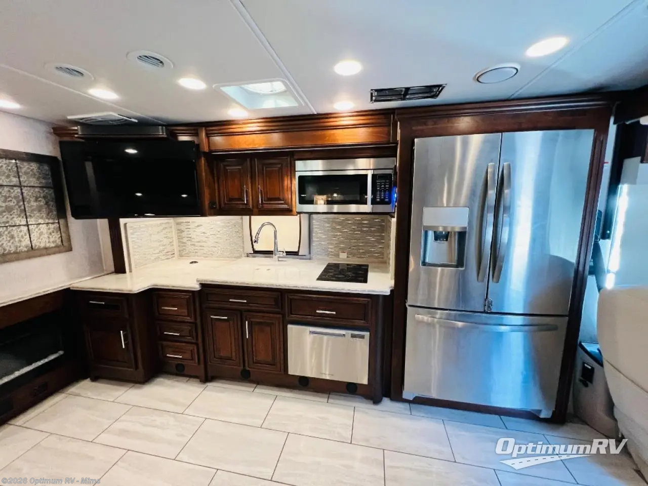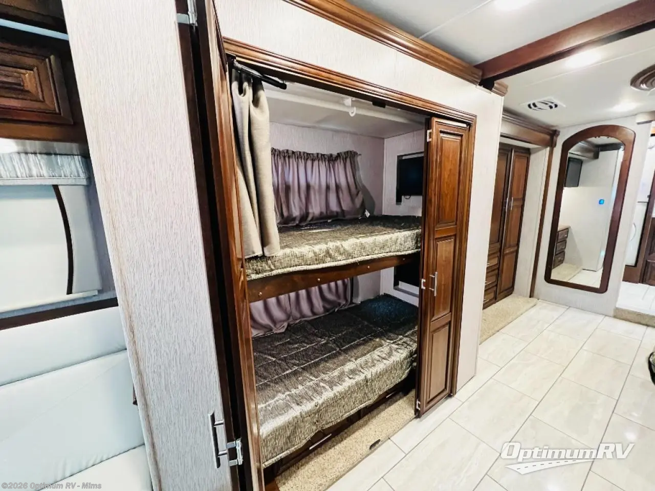 Experience a home away from home with this motorhome! The whole family will have a comfortable place to sleep between the bunk lift above the cab, the 72" x 80" king bed, the set of 30" x 73" bunk beds with a hinged top bunk and two LED TV's, the hide-a-bed sofa, and even the booth dinette once converted. Storage space isn't lacking with overhead cabinets all throughout, full height wardrobes, full height pantry, and linen closet. The full rear bathroom has a 38" x 32" shower and an area prepped to add an optional washer and dryer, and the second full bathroom has a 30" x 36" shower so everyone can get ready two times faster. The porcelain tile flooring throughout will be easy to clean and the fireplace creates the perfect relaxing evening indoors. Watch the big game at the exterior entertainment center while staying protected by the 18' Carefree latitude with LED lights and wind sensor!