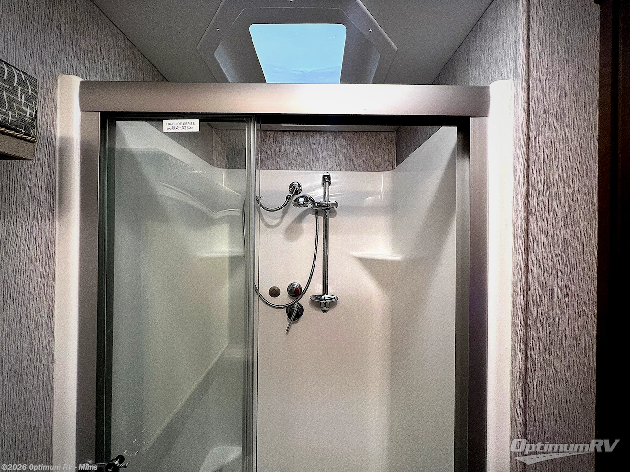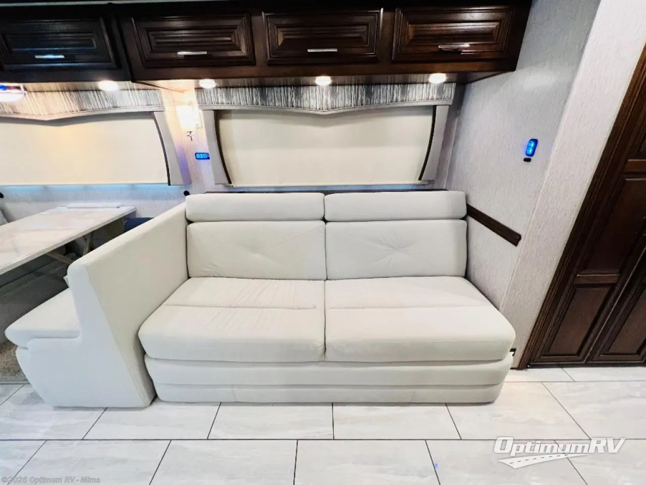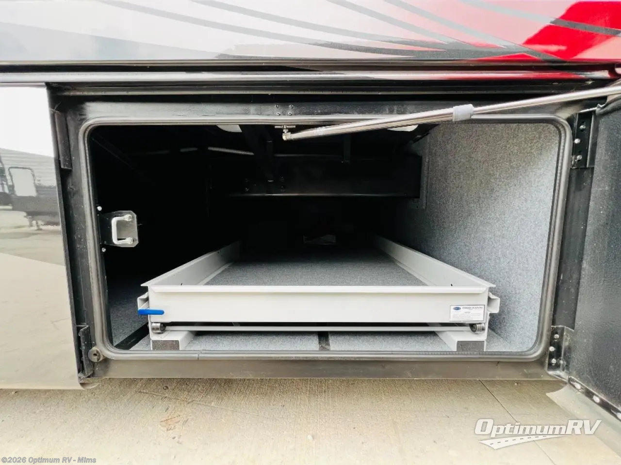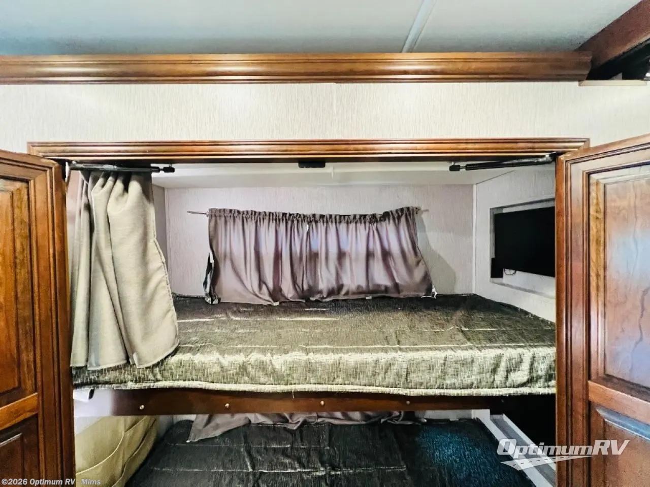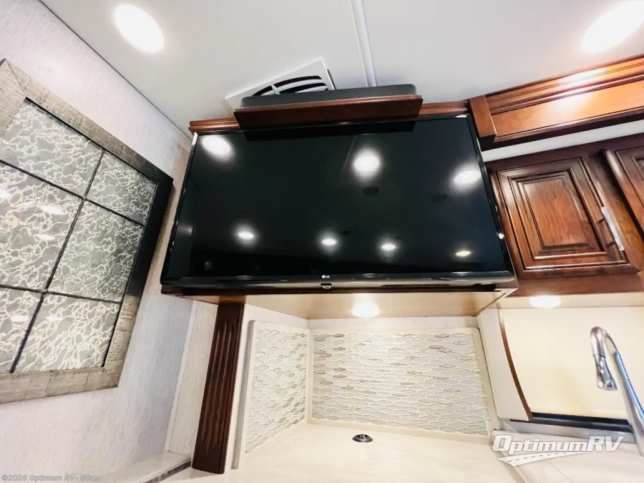 Experience a home away from home with this motorhome! The whole family will have a comfortable place to sleep between the bunk lift above the cab, the 72" x 80" king bed, the set of 30" x 73" bunk beds with a hinged top bunk and two LED TV's, the hide-a-bed sofa, and even the booth dinette once converted. Storage space isn't lacking with overhead cabinets all throughout, full height wardrobes, full height pantry, and linen closet. The full rear bathroom has a 38" x 32" shower and an area prepped to add an optional washer and dryer, and the second full bathroom has a 30" x 36" shower so everyone can get ready two times faster. The porcelain tile flooring throughout will be easy to clean and the fireplace creates the perfect relaxing evening indoors. Watch the big game at the exterior entertainment center while staying protected by the 18' Carefree latitude with LED lights and wind sensor!
