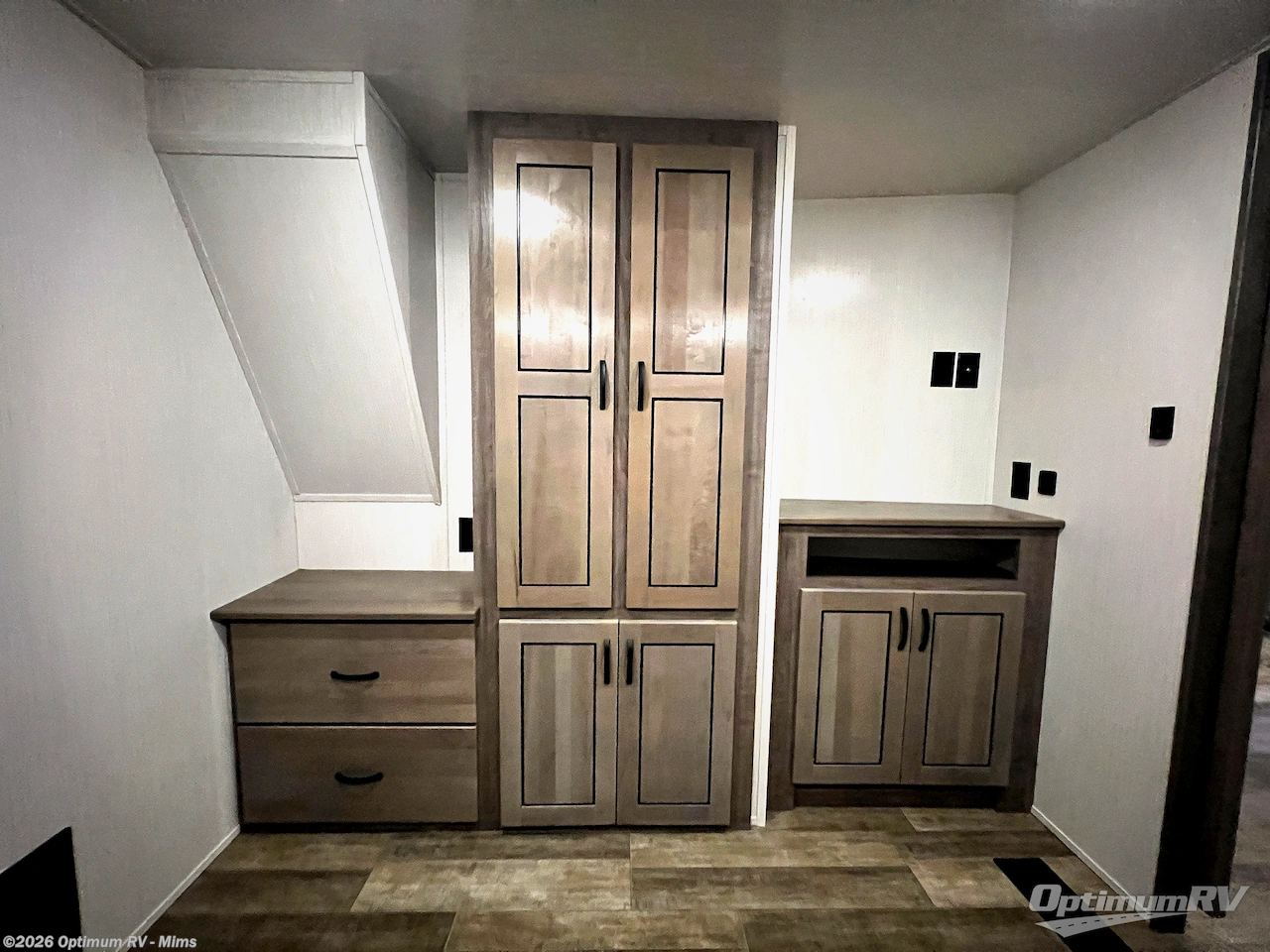 With two bedrooms, everyone will enjoy a good night's rest in this Cedar Creek fifth wheel! The front private bedroom has a king bed across from a dresser with a 32" TV and a full-width wardrobe with storage shelves and an area prepped to add the optional washer and dryer. The second bedroom has hide-a-bed sofa across from a wardrobe with a 91" x 64 1/4" loft above it all for extra sleeping and storage space. Everyone can freshen up each morning in the full bathroom that has a shower with a seat and a linen closet to store your towels. You can whip up a delicious home-cooked meal indoors with the kitchen island, or if you wish to add the optional exterior pull-out kitchen, then you can breathe in some fresh air while you grill!