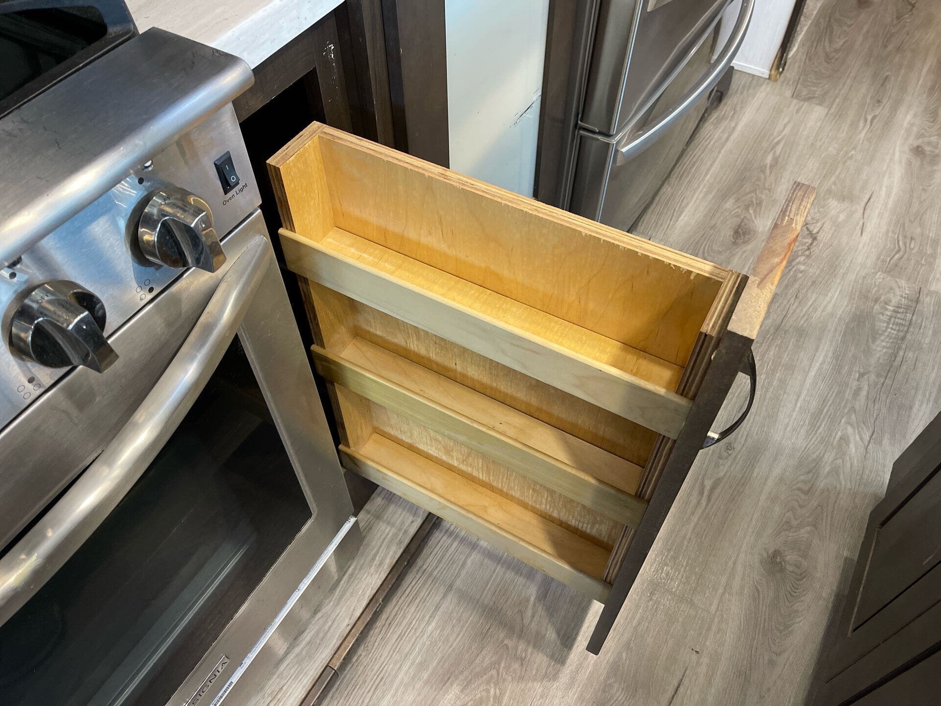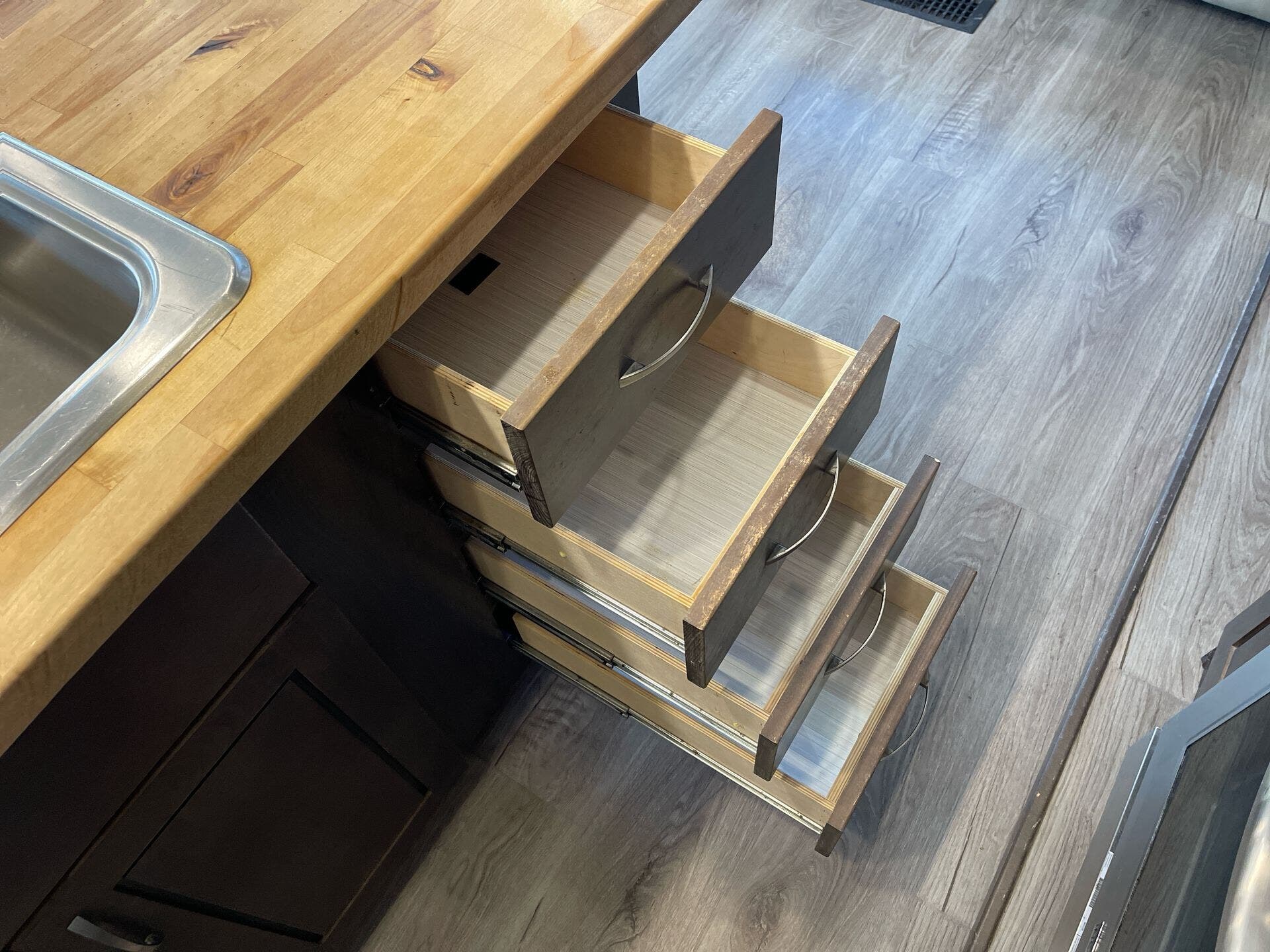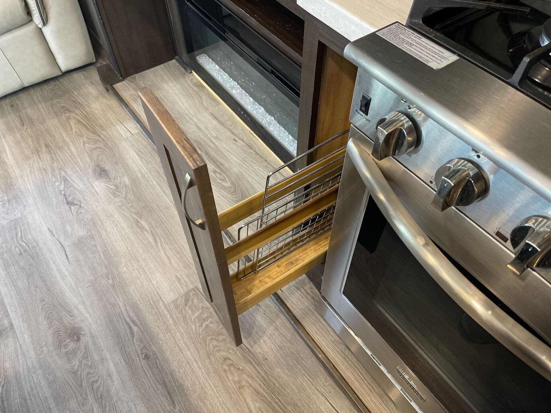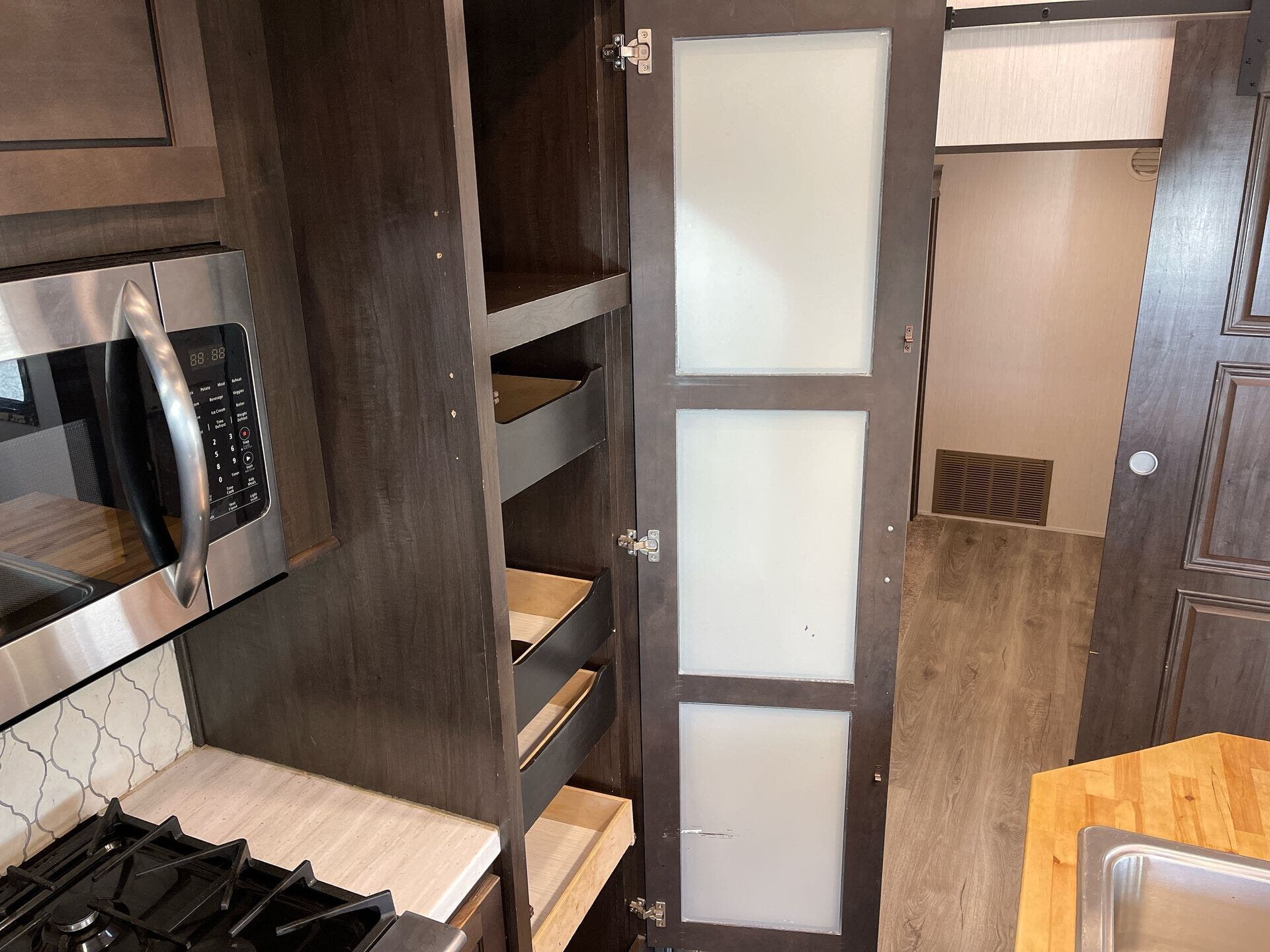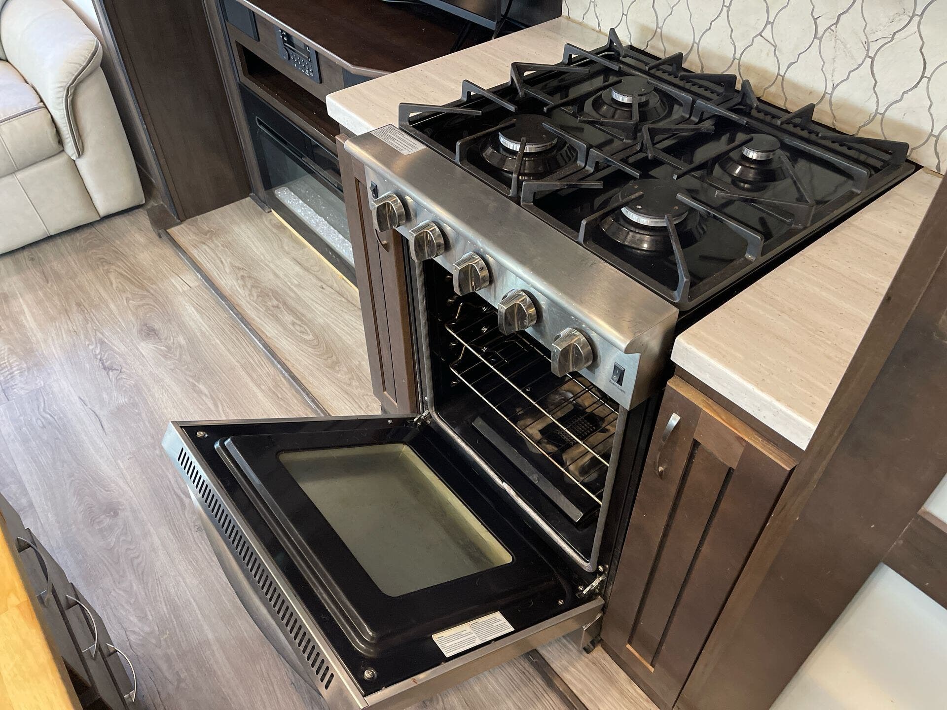 The well-appointed kitchen features a generous island with a deep sink, solid-surface countertops, a three-burner range with oven, microwave, and a residential-style refrigerator. A large pantry and abundant cabinetry keep gear organized, while the adjacent dining area offers a booth dinette.