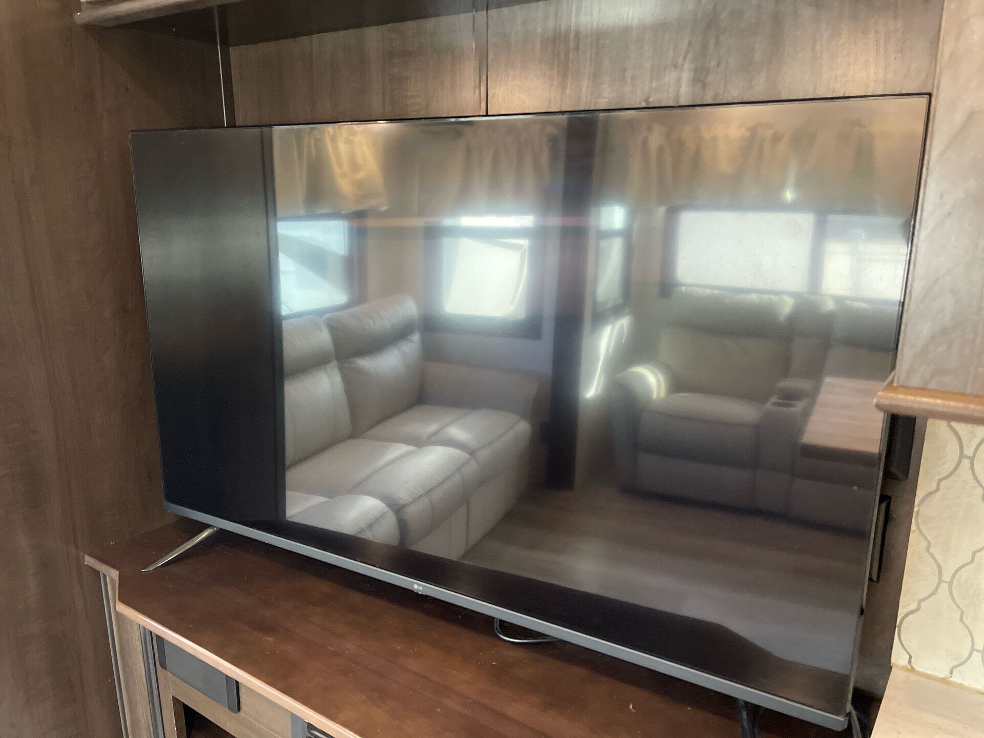 Moving forward, the main living space feels open and inviting, thanks to a combination of dual opposing slides that expand the interior footprint. Plush seating includes theater chairs and a tri-fold sofa positioned across from an entertainment center with a large TV and electric fireplace — turning the living area into a comfortable home away from home.