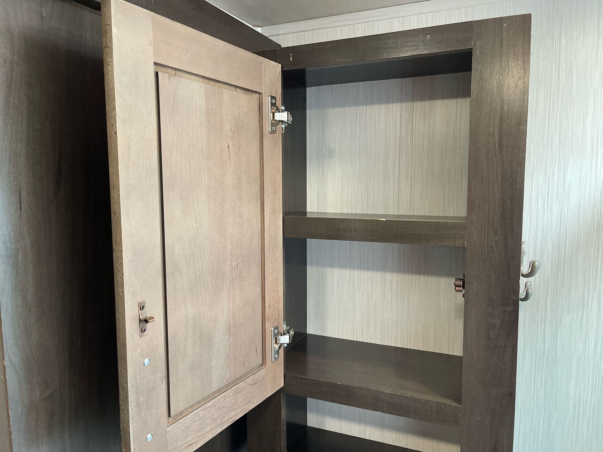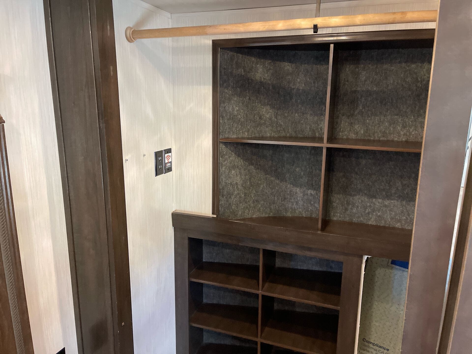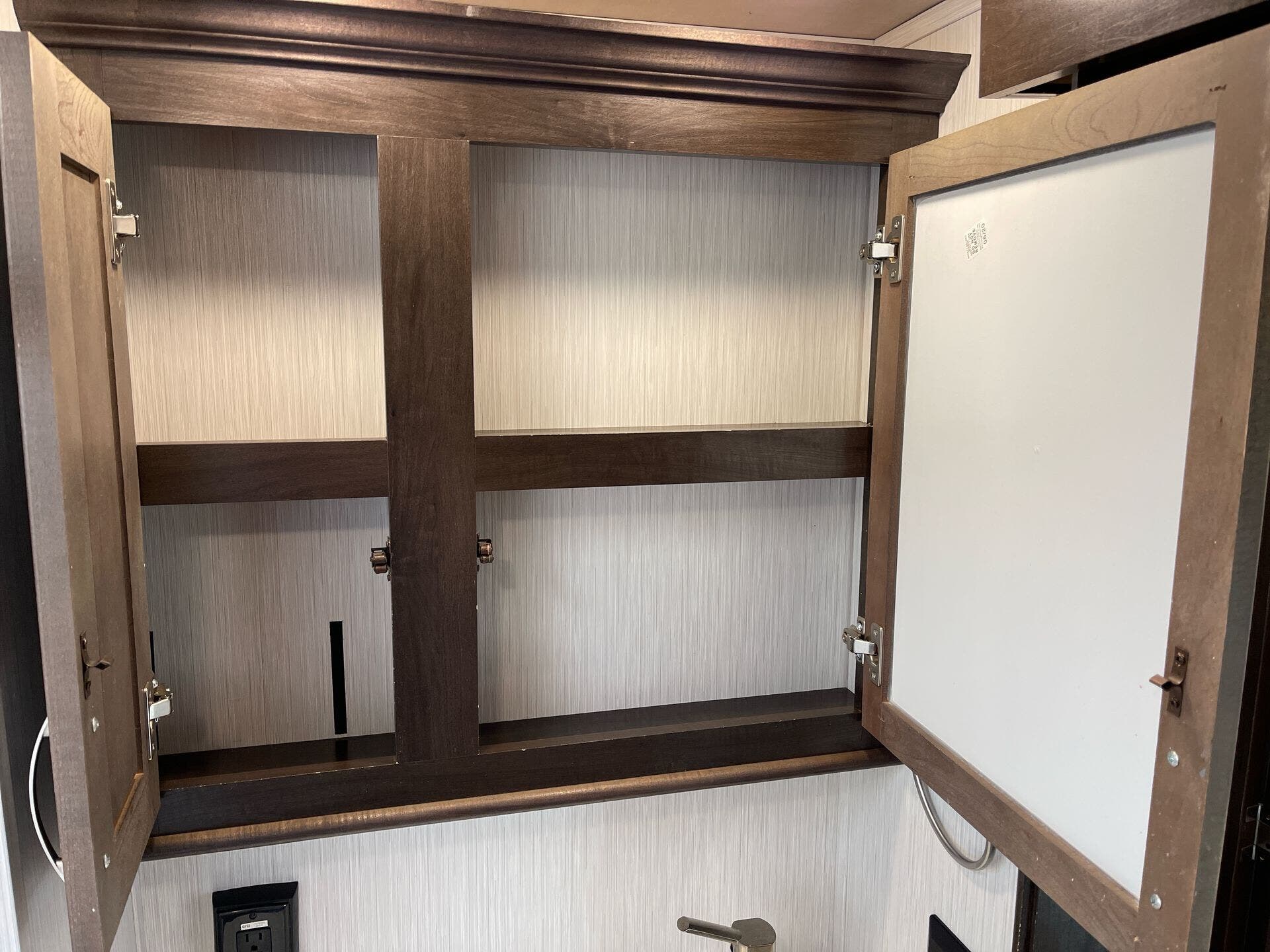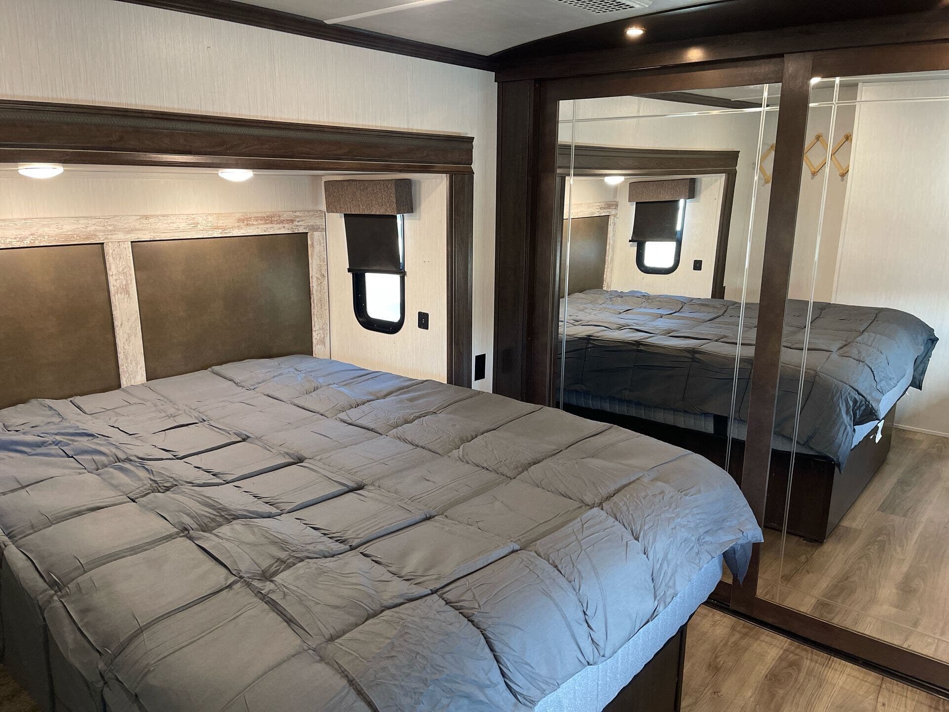 Up front, a private master bedroom boasts a king-size bed, plenty of storage, and a wardrobe with washer/dryer prep. The full bathroom includes a residential shower with glass door, linen storage, and a second entry from the hallway. With quality construction, four-season insulation, and thoughtful details throughout, the Cedar Creek Silverback 37MBH combines space, comfort, and functionality — making it ideal for extended trips or full-time RV living.