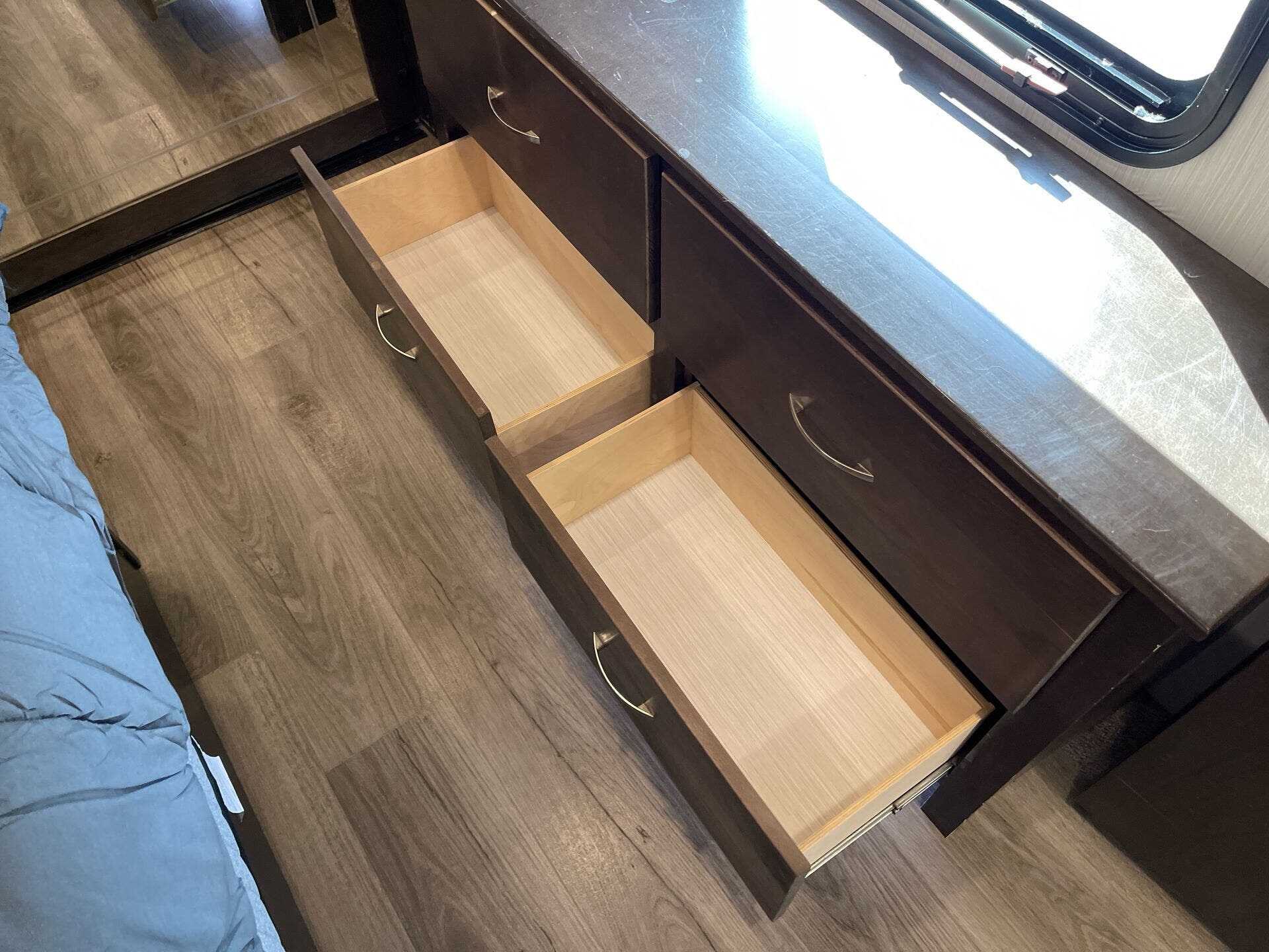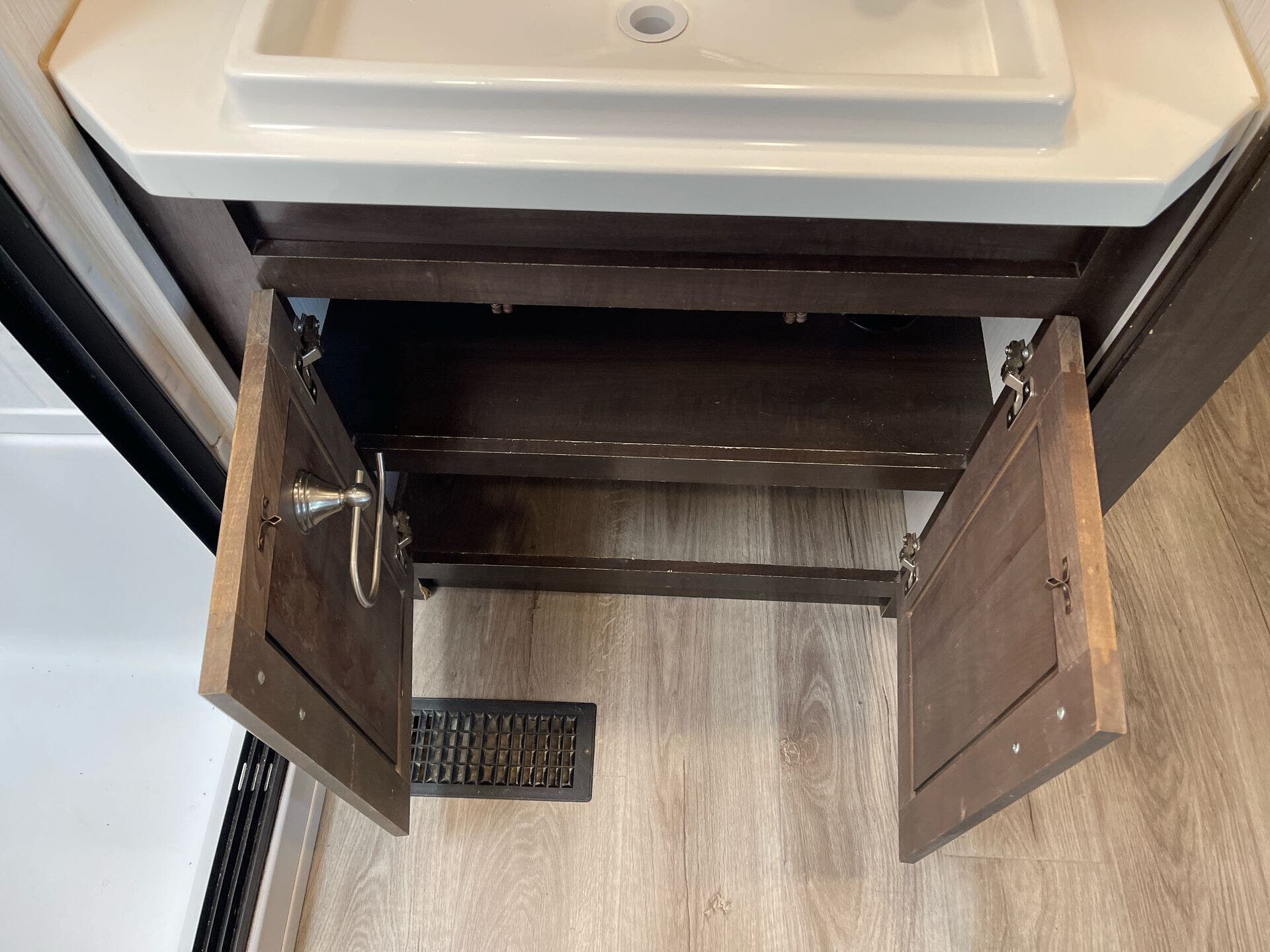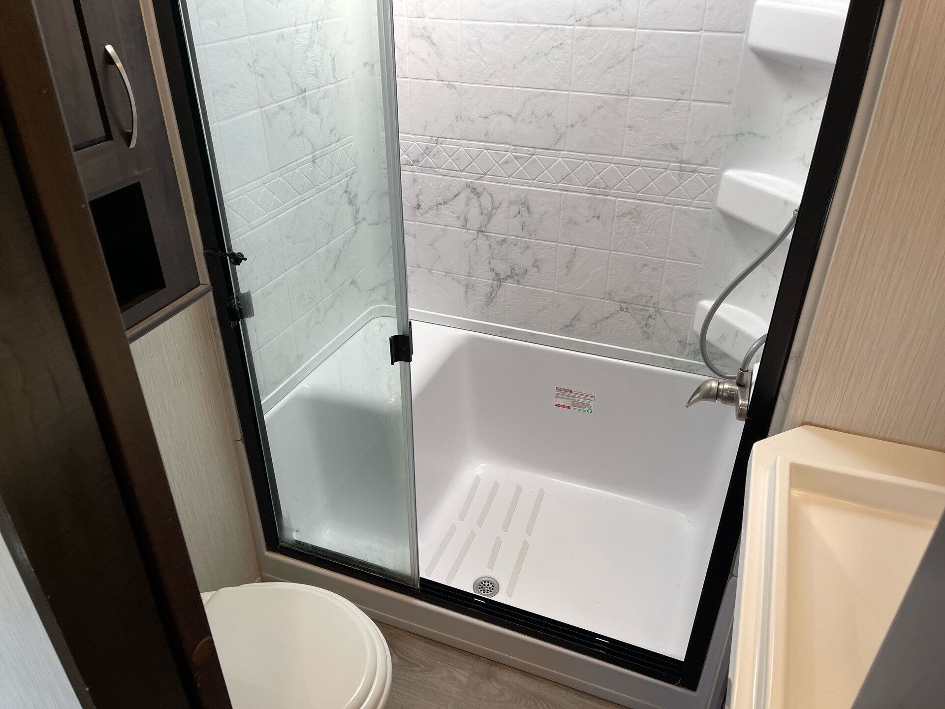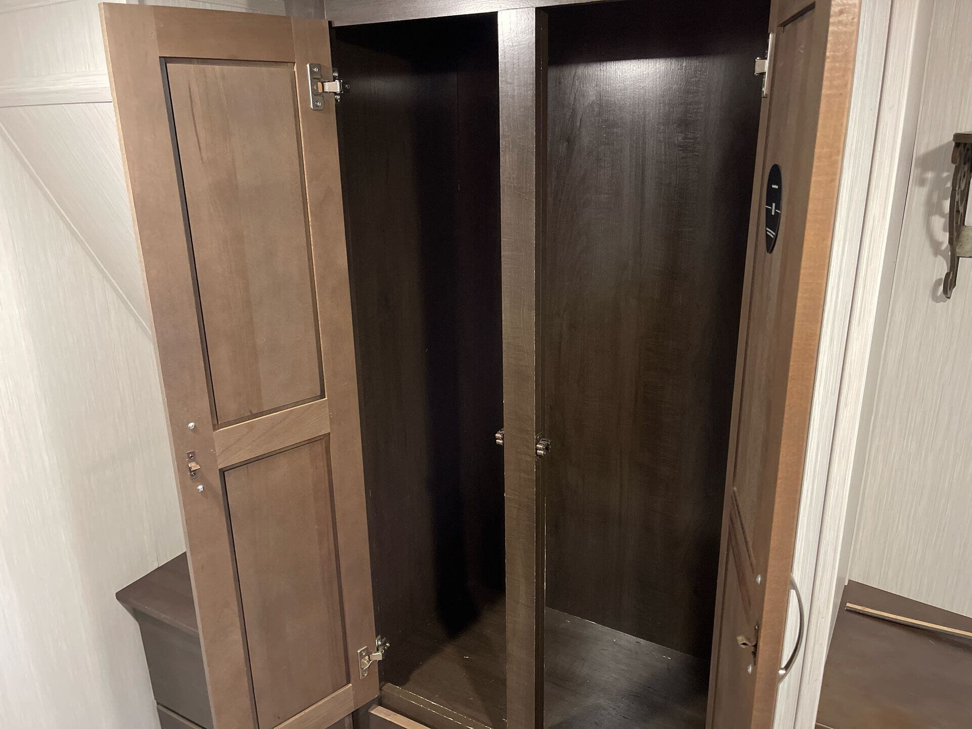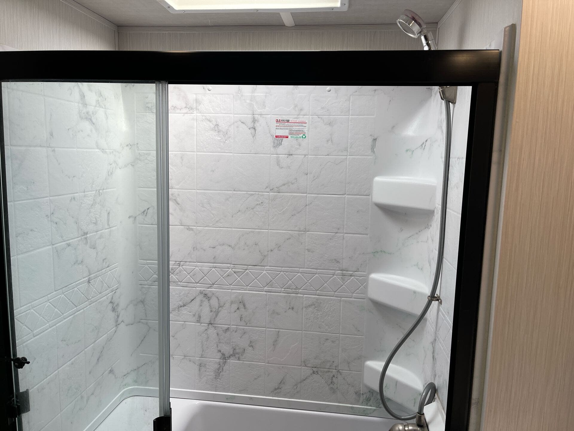 Up front, a private master bedroom boasts a king-size bed, plenty of storage, and a wardrobe with washer/dryer prep. The full bathroom includes a residential shower with glass door, linen storage, and a second entry from the hallway. With quality construction, four-season insulation, and thoughtful details throughout, the Cedar Creek Silverback 37MBH combines space, comfort, and functionality — making it ideal for extended trips or full-time RV living.