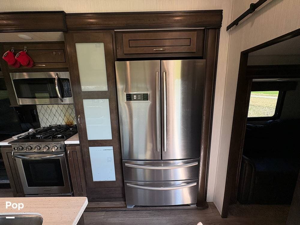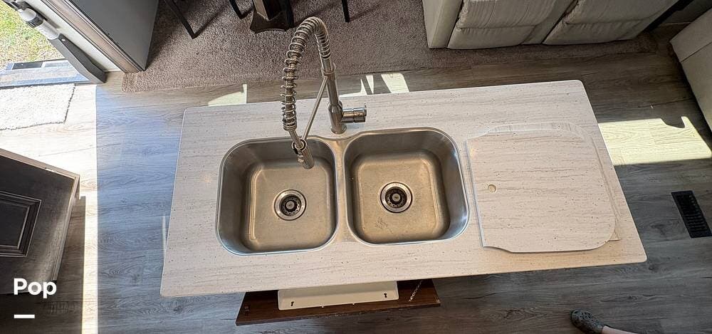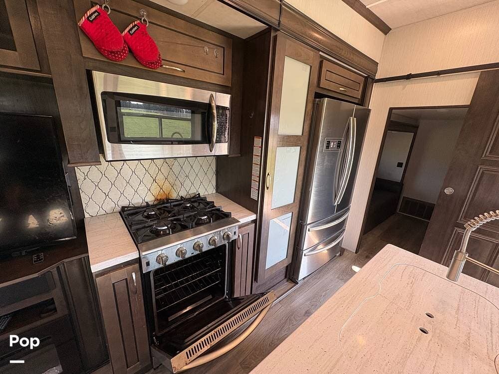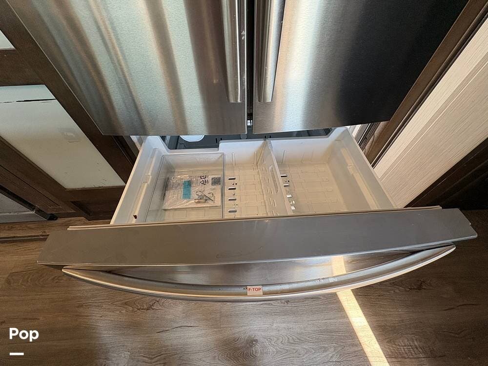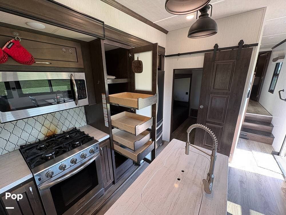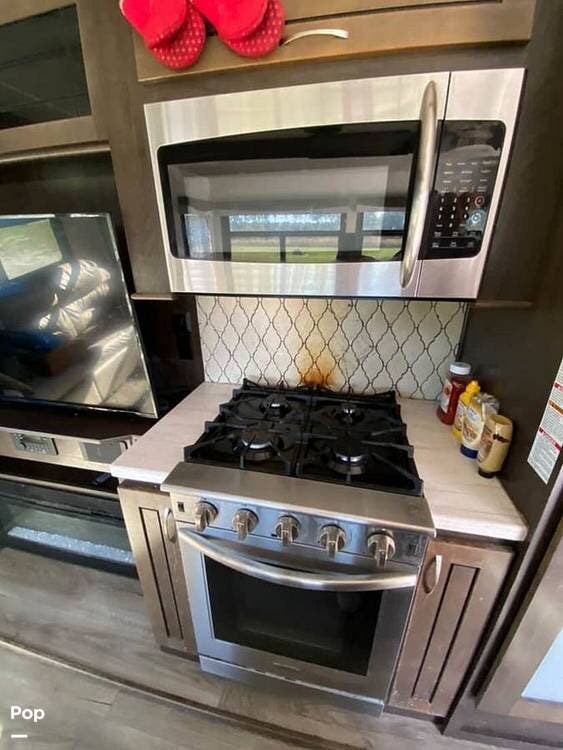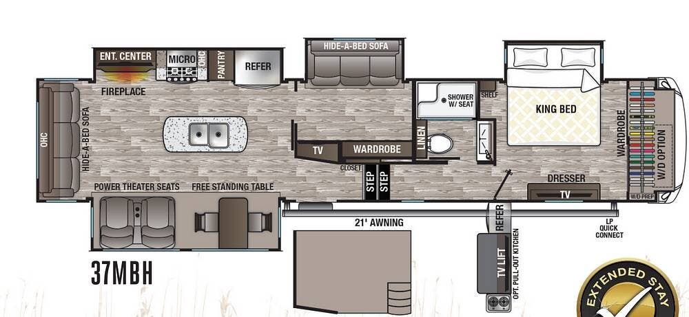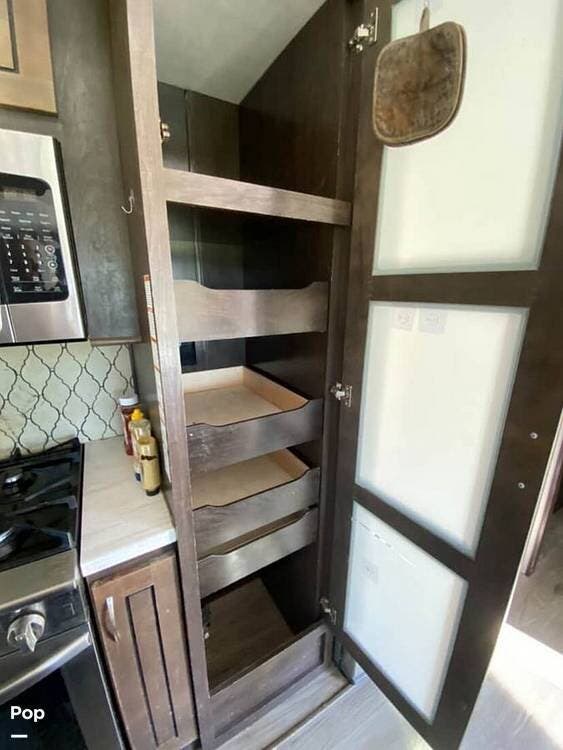 The kitchen is where this 37MBH truly shines. A residential refrigerator with an ice maker means no sacrificing cold storage. The residential gas range with four large burners and a full-size oven lets you cook real meals, not just quick campsite snacks. The sink is deep and spacious, the kitchen island is ready for everything from large pots to everyday dishes, and the pantry storage ensures there's room for all the essentials. This is a kitchen built for gathering, cooking, and enjoying time together.