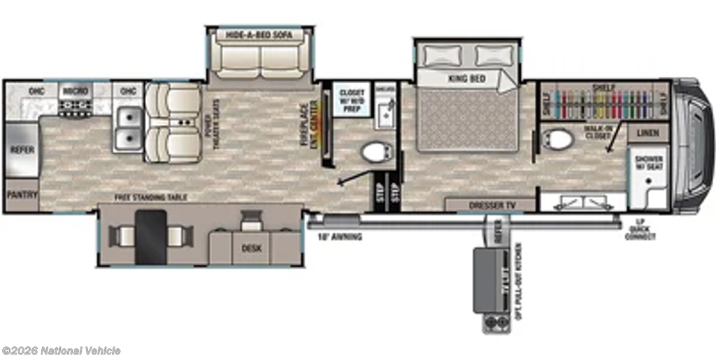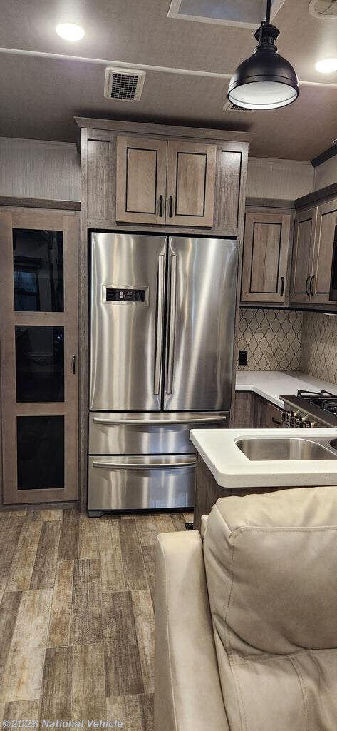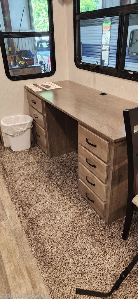 The popular rear kitchen floorplan offers an abundance of counter space, a large pantry, and a residential 20-cu-ft stainless steel refrigerator, making meal prep and storage easy for long trips. A free-standing dining table provides a comfortable place to gather for meals, while the nearby desk workspace adds convenience for remote work or trip planning.