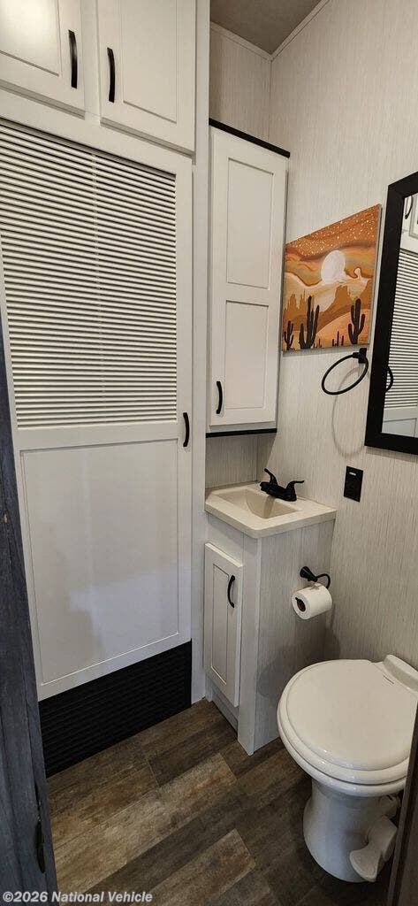Up front, the private master suite features a king-size bed, generous wardrobe storage, and a spacious full bathroom with a large shower and linen storage. This model also includes the convenience of a bath and a half, along with a stackable washer/dryer for extended stays.