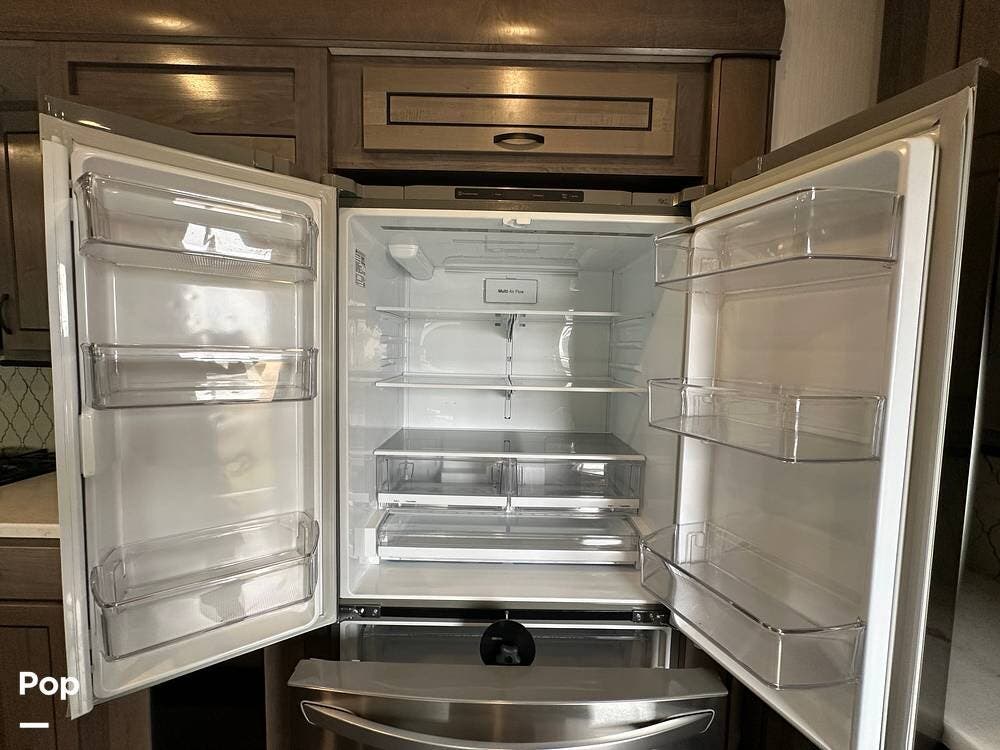 The kitchen has a residential stainless steel French door refrigerator, a 4-burner oven, and an over-the-range microwave. It also features solid-surface countertops, ample cabinetry, and a spacious pantry with pull-out drawers.