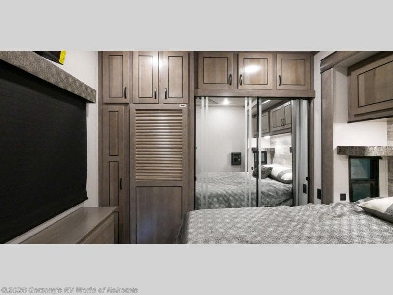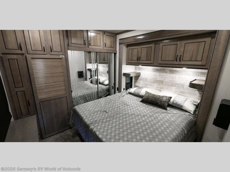 Your wait is over, this destination trailer is ready for your next stay! As you enter you will feel the comfort and spaciousness of the combined kitchen and living area with dual slide outs, and you can relax on the hide-a-bed sofa up front, the power theater seats or eat a snack at the free-standing dinette. You can enjoy the outdoors inside through the full view windows, and will have residential style throughout, plus full amenities in the kitchen. The rear master bedroom offers you a king bed slide, a dresser, a wardrobe and a closet prepped for a washer/dryer option as well as the second entry so you can get outside quickly to relax under the 18' electric awning. You will find so many more features to enjoy, plus there are several options you might like to add to enhance this already amazing destination trailer.