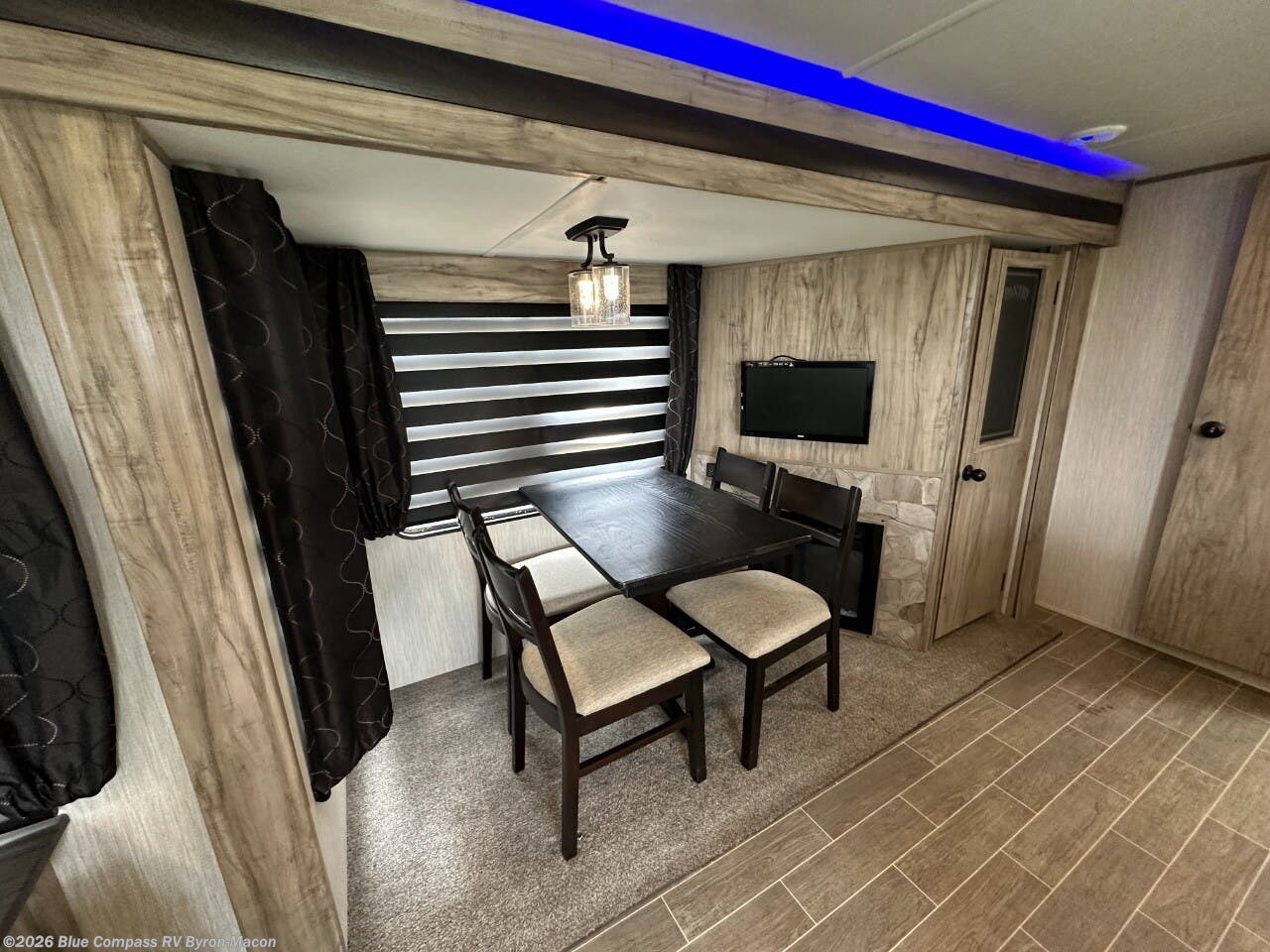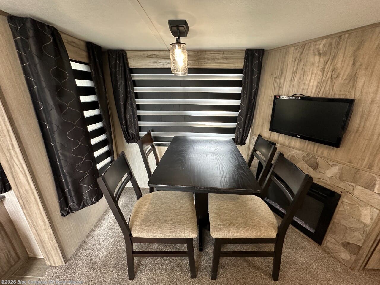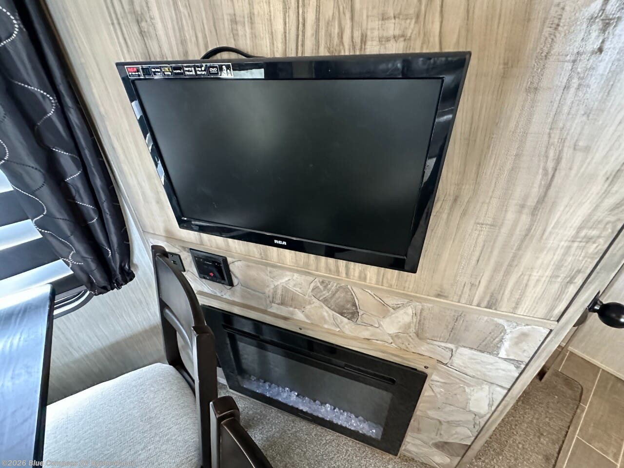 If you're looking for a dynamic, weight conscious travel trailer for you and your spouse to take to your favorite campsite then you need this one! The cross conversational area includes a deluxe tri-fold hide-a-bed sofa with a panoramic rear window to look out at the lake, a free standing table with four seats, and a fireplace to enjoy on those cool nights, just grab a snack from the walk-in pantry and you're all set for the perfect evening. The walk-through bathroom has a radius shower with opaque glass doors, a skylight, and a linen closet, plus you can enter right into the front private bedroom. The bedroom has a comfortable queen bed with nightstands and shirt closets on either side to keep your clothes looking their best, and you can even choose to add an optional TV for your entertainment. The exterior features an oversized 20' awning, a deluxe outside kitchen, and a full pass-through storage area to keep all of your camping gear!