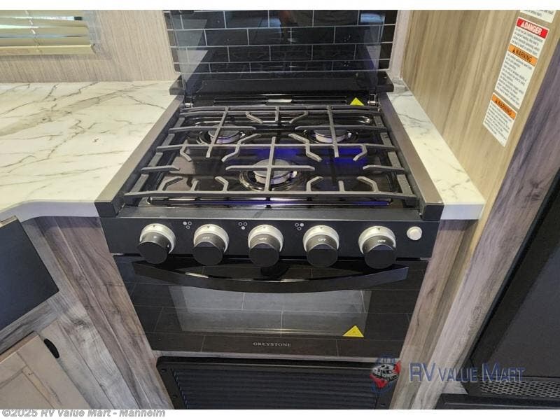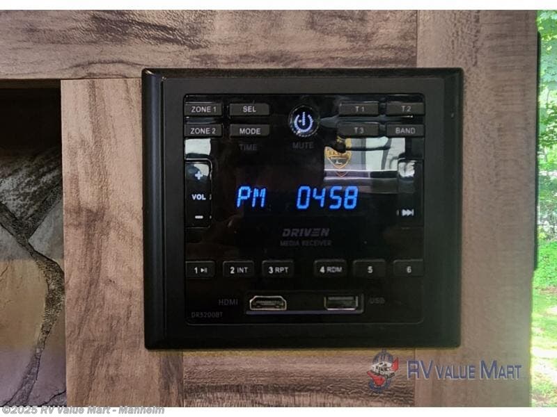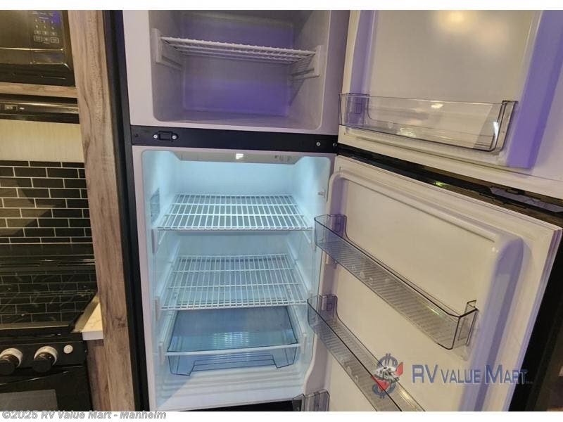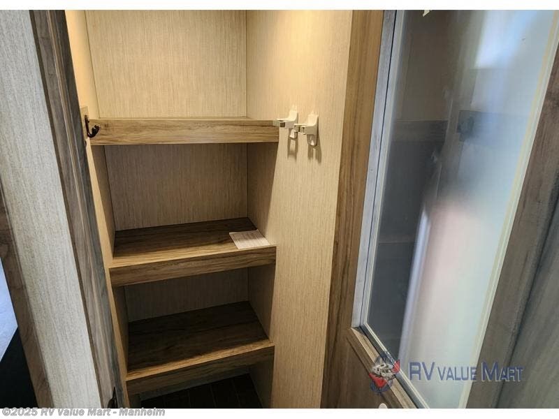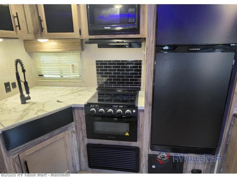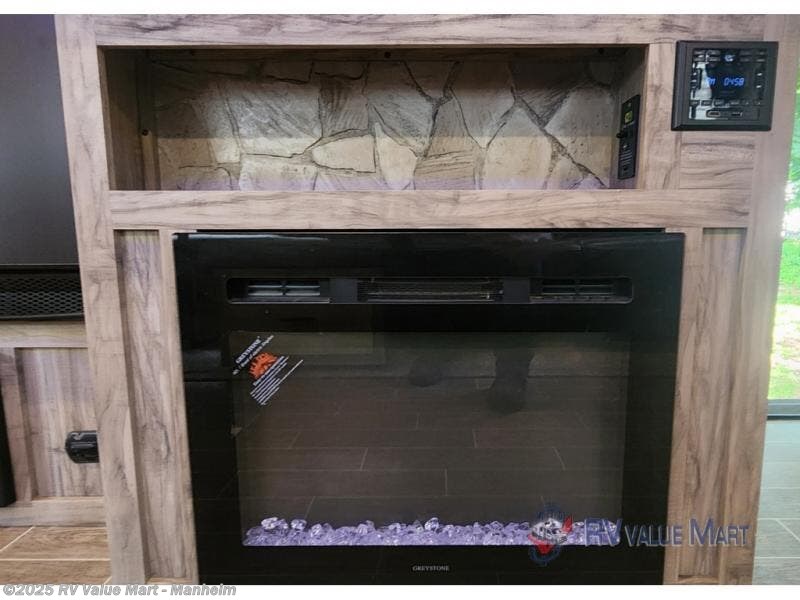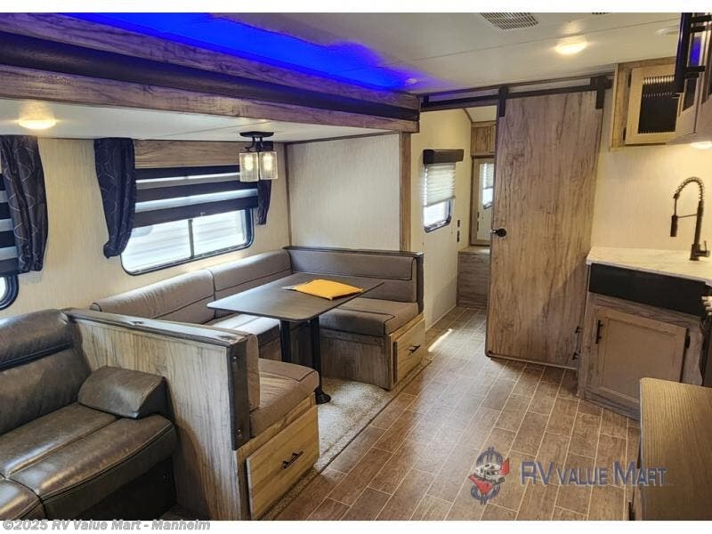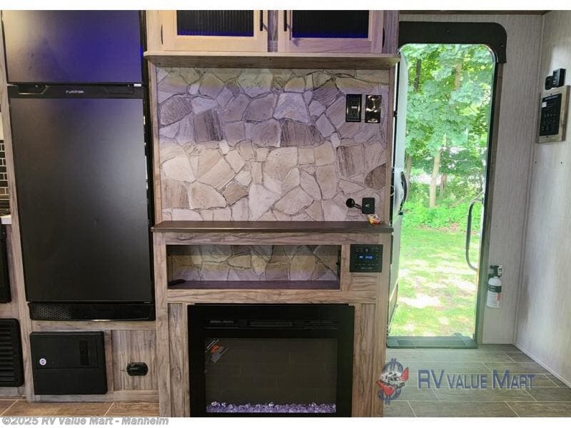 Spend the summer at your favorite campsite in this travel trailer! You will find an abundance of storage throughout between the walk-in pantry, the overhead cabinets, the shirt closets on either side of the queen bed, and the linen closet in the bathroom, plus the exterior full pass-through storage area is big enough to store all of your camping gear. The full rear bathroom has a robe/towel drop zone for your convenience and a stylish barn-style door to close it off for privacy. The jackknife sofa and oversized U-shaped dinette slide is the perfect place to wind down your nights in true comfort with the fireplace going while you play a card game or watch a movie if you choose to add the optional TV. The chef of your group will love cooking indoors with the three burner cooktop, but love cooking outdoors even more with the outside kitchen which even has a sink and a residential refrigerator for you to enjoy a cold beverage without going inside!