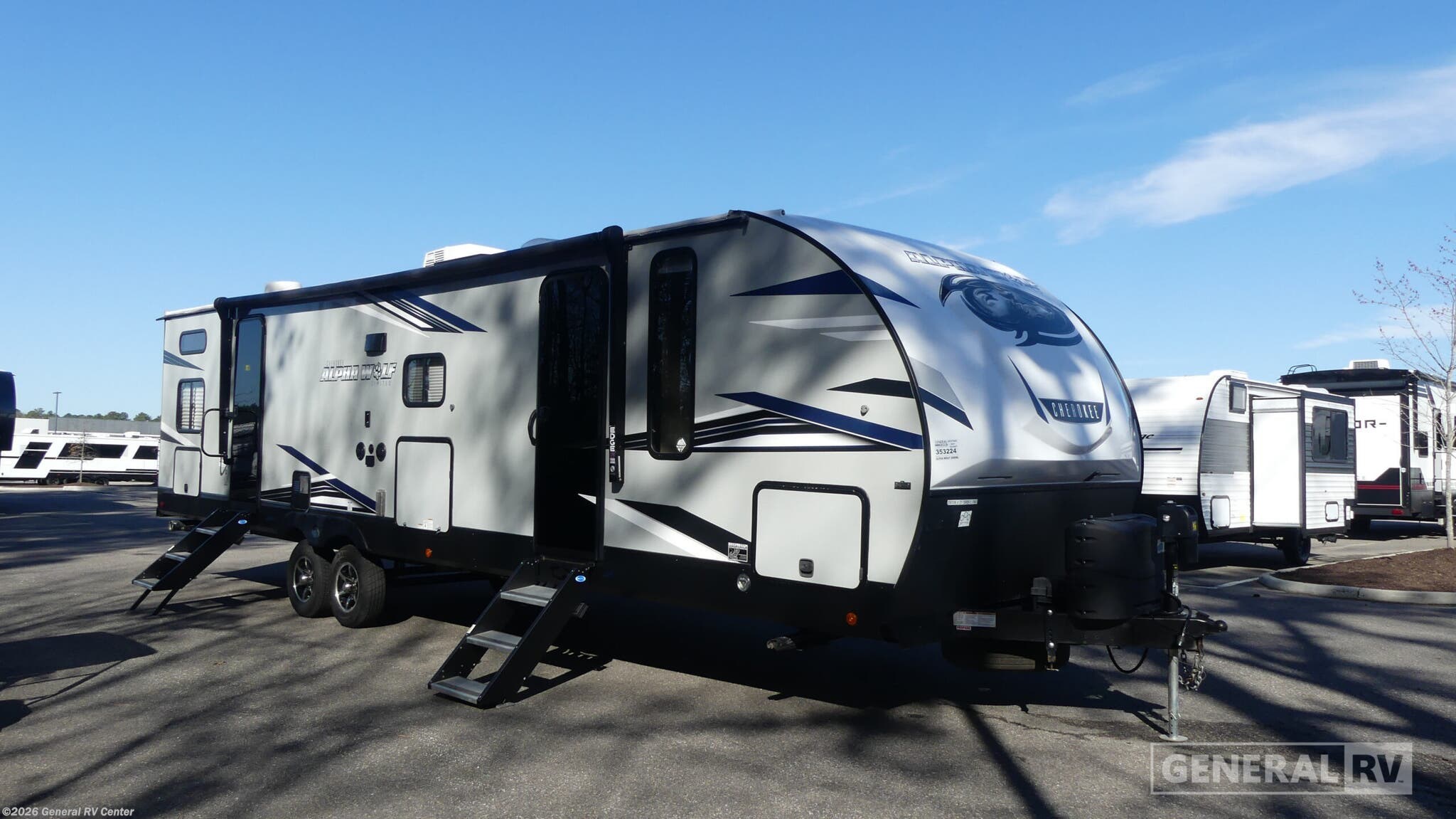 **Forest River Cherokee Alpha Wolf travel trailer 30RDB-L highlights:** - Fireplace - Jackknife Sofa - Dual Entry Doors - Front Private Bedroom - Bunk Beds - Pass-Through Storage Don't pass up your chance to camp with the whole family in this luxurious travel trailer! It features a rear private bunkhouse with double stacked 54" x 74" bunk beds with storage below the lower bunk, a wardrobe, and a barn-style door for added privacy. The jackknife sofa and super U-shaped dinette slide opens up the kitchen and living area for more walking around space while you prepare dinner. You can also store everyone's favorite snacks in the walk-in pantry so they can enjoy them while relaxing on the sofa in front of the fireplace. The full bathroom has a radius shower for you to freshen up in each morning and even has three entrances so you can access it from inside or outside. The deluxe outside kitchen comes equipped with a refrigerator, two burner cooktop, and even a sink! You will be one happy camper with any one of these Forest River Cherokee Alpha Wolf travel trailers! You will not only find top shelf amenities, but also a tougher, lighter, and better insulated shell with the engineered wood SuperTruss roof structure with 3/8" fully walkable decking. The LED interior and exterior lighting packages make it possible to see whether day or night, and the unobstructed pass-through storage area lets you easily access your camping gear. A few other features you will love having are the aluminum rims with tire pressure monitors, the Alpha bath fixtures, the power tongue jack, and the super-plush Evergreen mattress with a deluxe bedding package. You won't be disappointed with any one of these travel trailers!