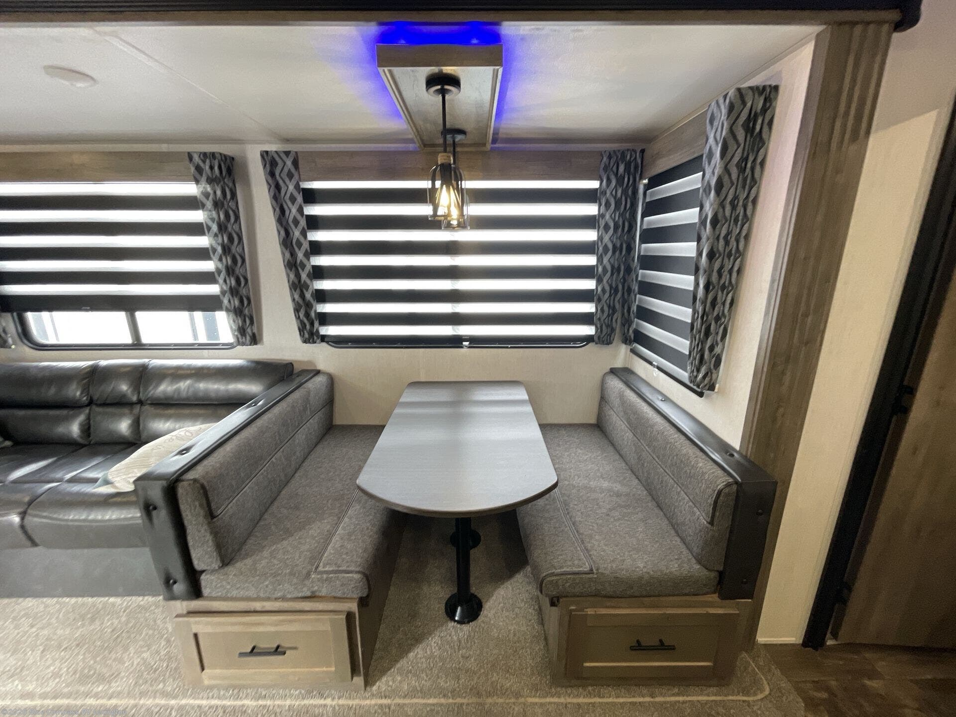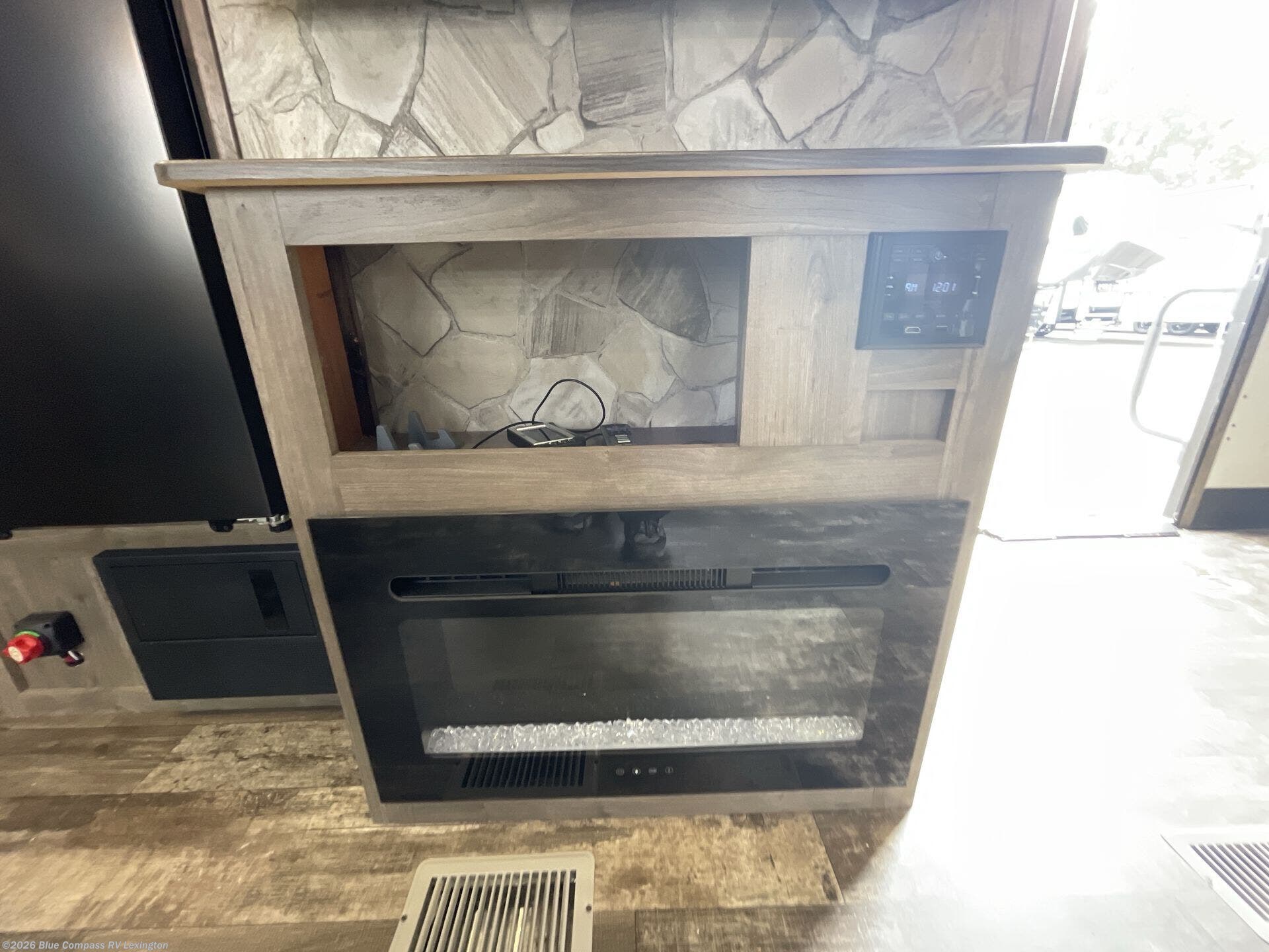 Load up the kids or invite your neighbors and head out on adventure in this toy hauler that can comfortably sleep eight people each night. When the Happijac beds are not in use, you will have garage space to store your kayaks or dirt bike. Within the large slide you will find the jack knife sofa and booth dinette that will be perfect for relaxing, game night, and additional sleeping space, and the fireplace will make it feel more like home. The chef of your group will have their choice to cook indoors or outdoors on the outside kitchen, and there is a 15' power awning for shade. This model also includes a front private bedroom with a Wolf Pack king bed, dual night stands, and dual wardrobes for all your clothes!
