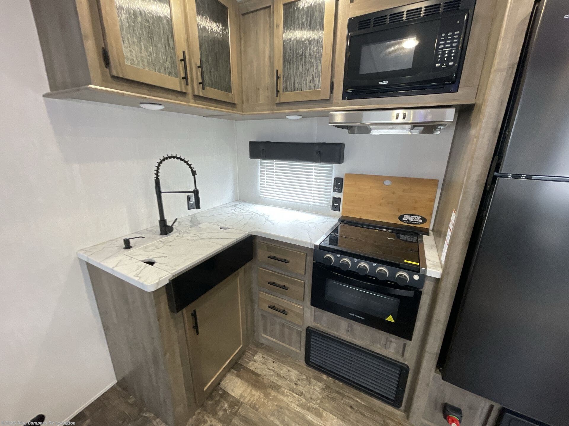 The versatile Cherokee Wolf Pack toy haulers are ready for all your excursions! Each model includes a true high gloss gel coat, a 102" wide body design, and a forced air heated underbelly and enclosed holding tanks so you can camp year around. You will enjoy hassle-free features such as, the in cab tire pressure monitor system, the Happijac bed lift system, and the 100 gallon fresh water capacity. Each model includes a shower skylight, LED interior/exterior lights, Zebra shades in the living area, and a black stainless steel farm sink for that added touch-of-home. The fifth wheels include stabilizer jacks, a second 15K A/C unit in the bedroom, and 50 Amp service. You will appreciate 30 Amp service in the travel trailers, a power tongue jack, and ramp door cables. These toy haulers also include USB charging stations to keep all your gadgets charged and ready to go, premium Teddy Bear bunk mats for comfortability, and a reverse activated light and backup camera for easy loading and unloading!