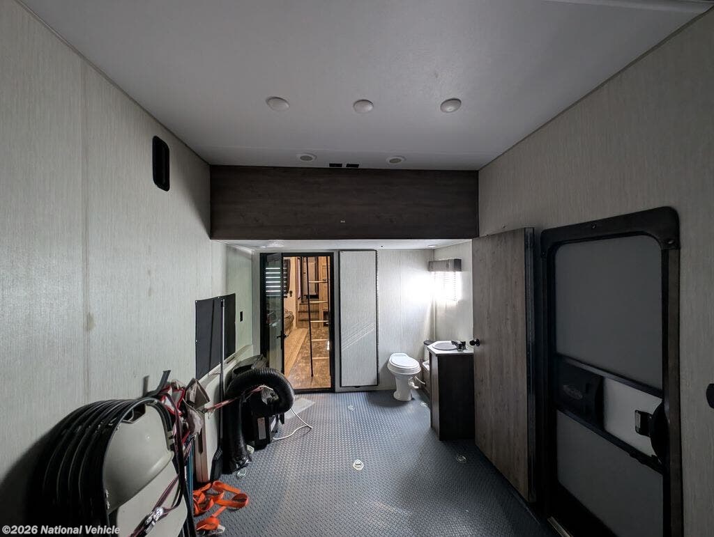 The expansive 16? garage provides plenty of room for ATVs, bikes, or other gear, complete with a ramp door that doubles as a patio deck for relaxing after a day of adventure. Inside, the open-concept living area features residential-style furnishings, a large slide-out for extra space, and a full entertainment setup. The kitchen is fully equipped with stainless steel appliances, solid-surface countertops, and ample storage, making meal prep simple and convenient.