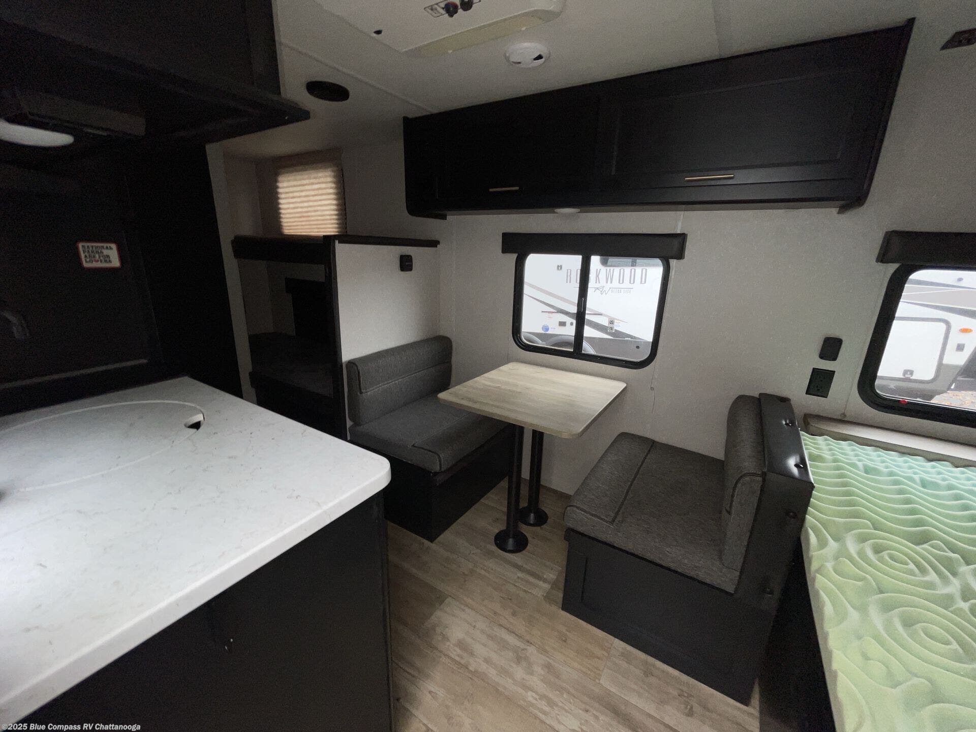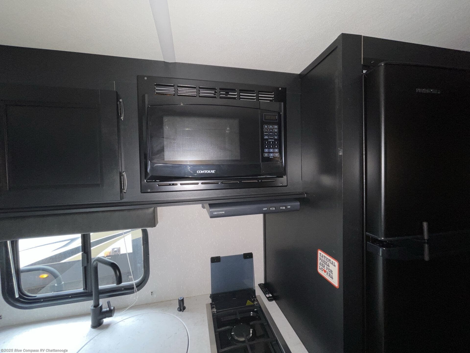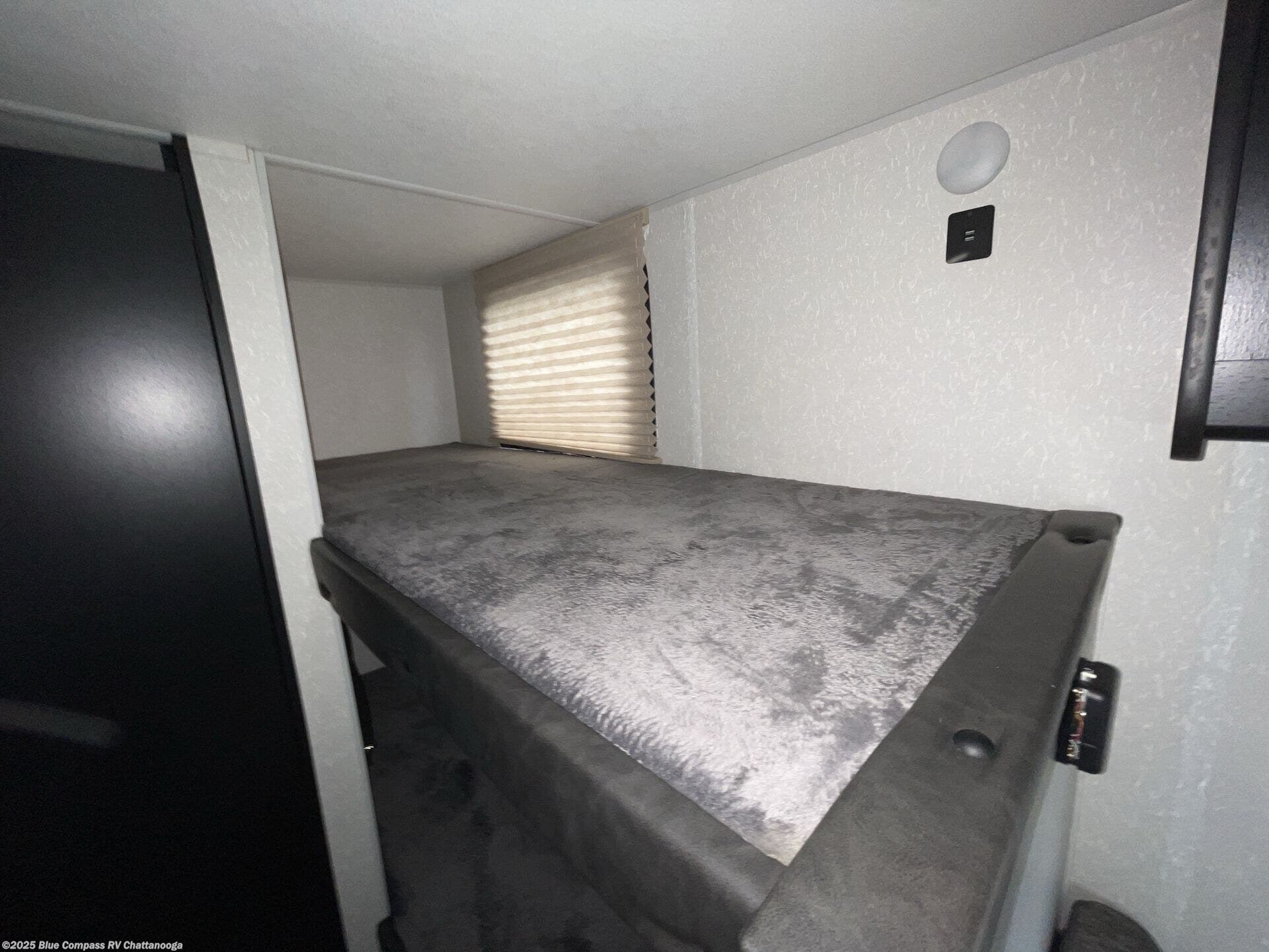 Imagine your kids on the rear bunk beds in this Cherokee Wolf Pup travel trailer while you enjoy the front queen bed before everyone gets up to make breakfast and head out for a hike. The kitchen includes a high-output cooktop and microwave, as well as a refrigerator to store your leftovers and a sink to wash the dishes. You will find storage in the overhead cabinets, and there is a shelf by the queen bed. Your hiking gear can also be stowed out in the outside storage.