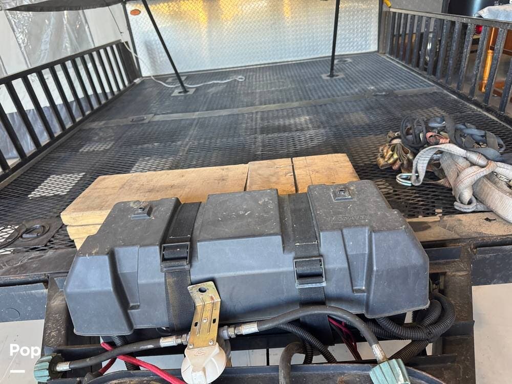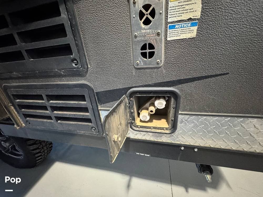 As you enter the camper, to the left, there is a cabinet, a shower, a porta-potty, and an additional storage cabinet. The opposite side of the camper has a cabinet, a dinette slide-out, a swing galley, a three-burner range, a sink, and a refrigerator. In the front, you will find a 70" x 80" king tent bed, and in the rear, a 60" x 80" queen tent bed. Both mattresses feature electric heaters.