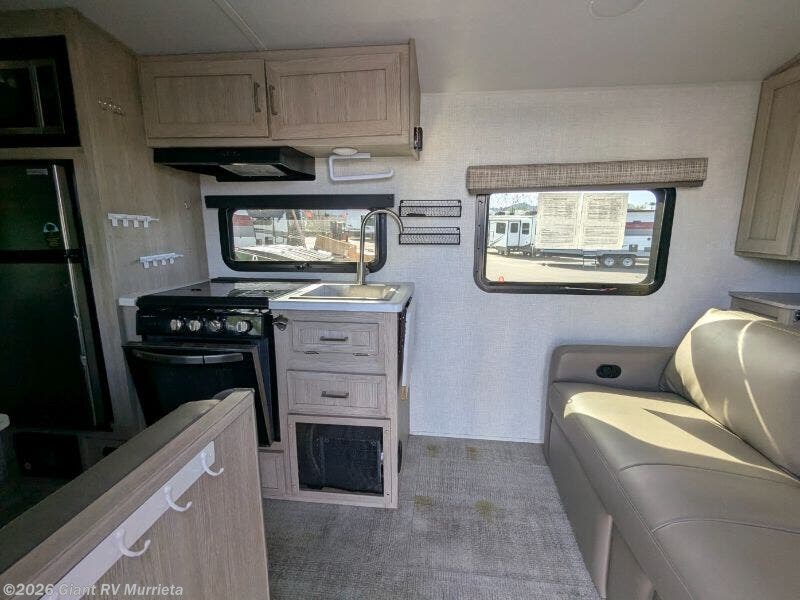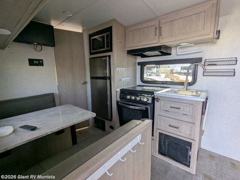 - Modern Kitchen: Equipped with a 6.3 cu. ft. 12V refrigerator, 2-burner cooktop, microwave, and stainless steel sink for easy meal prep.