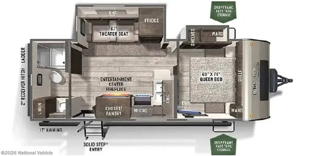Outside is where this unit really shines. Enjoy a 17? electric awning with LED lighting, solid step entry steps, exterior shower, and a solar panel for added off-grid capability. The 15,000 BTU air conditioner keeps things cool even in peak summer heat.