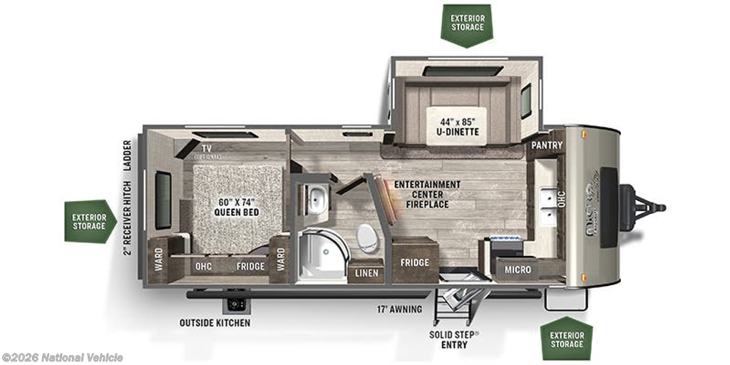 Slide-Out and Awning: The unit has one slide-out, creating additional interior space, along with a power retractable awning for outdoor relaxation.