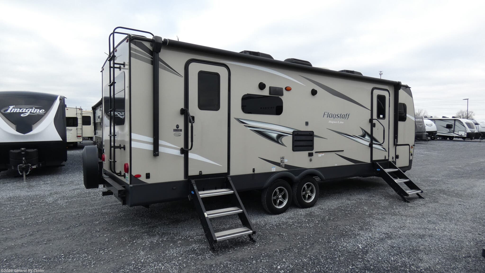 **Forest River Flagstaff Super Lite travel trailer 26RLSW highlights:** - Two Swivel Rockers - Dual Entry - Hide-A-Bed Sofa - Fireplace - Gas Griddle - Exterior Storage Storage is found throughout the interior in overhead cabinets as well as in the bedroom wardrobe slide, and more. You will also be able to stow away your outdoor gear in the exterior compartments. Once you have loaded everything up, you can head to your destination, set up and take a walk around the campground. Once you get back, relax under the power awning, make a meal on the gas griddle, or head inside to get cleaned up in the full bathroom. You can take a nap on the queen bed or the hide-a-bed sofa. The booth dinette offers extra sleeping space as well. And the two swivel rockers might just be your favorite spot. The kitchen includes an L-shaped counter including an extension, and everything you need. And the fireplace is a nice touch. It will be easy to make plenty of memories with your family when you choose to camp with a Flagstaff Super Lite travel trailer by Forest River. These models have beautiful slatewood cabinetry with hardwood cabinet doors and drawer fronts, solid surface kitchen countertops, and ceiling LED 12 volt interior lighting. The 6 sided aluminum cage construction offers lightweight towing, the radius roof with interior vaulted ceilings give you more headroom, the WiFi ranger Wifi booster Sky 4, the enclosed underbelly, and the power awning with adjustable rain dump and LED light strip, will give you years of enjoyment!