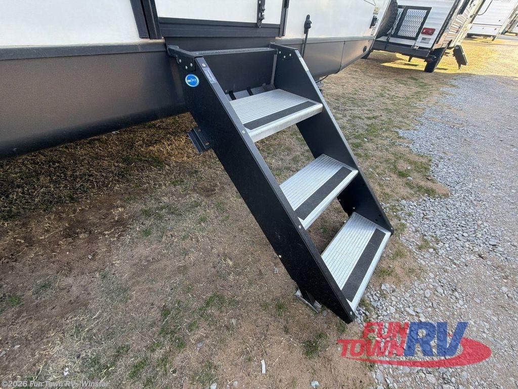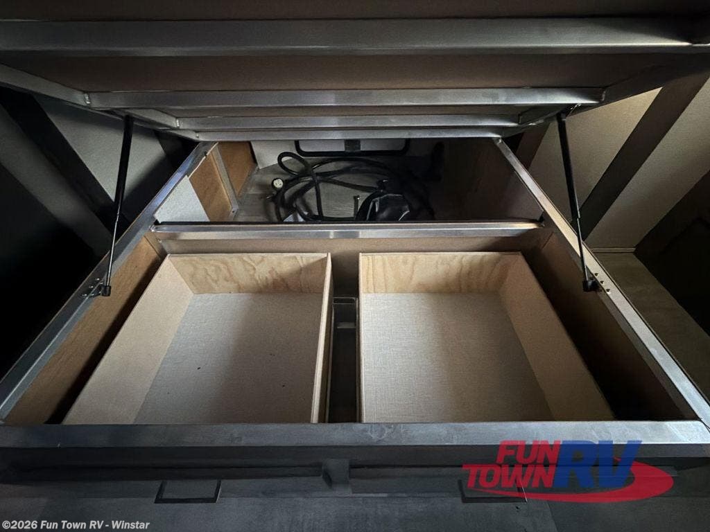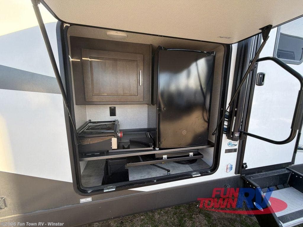 The kids are ready, are you? The kids can use the main entry to load their items in the private bunkhouse which includes two bunks and a Play-Cube sofa for those rainy days inside. You can use the master bedroom's exterior entry to load your clothing in the wardrobe and the front storage area with countertop for more items and even some picture frames once at your destination. You will also find a slide out queen bed. The main living and kitchen area includes a slide out with a 44" x 81" U-shaped dinette and 60" hide-a-bed sofa offering more floor space to do yoga, play Twister, or even stretch your legs out from the furniture. The cook will love the L-shaped counter space and countertop extension when washing the dishes. The outside kitchen will come in handy for outdoor cooking while visiting with everyone hanging out around the campfire.