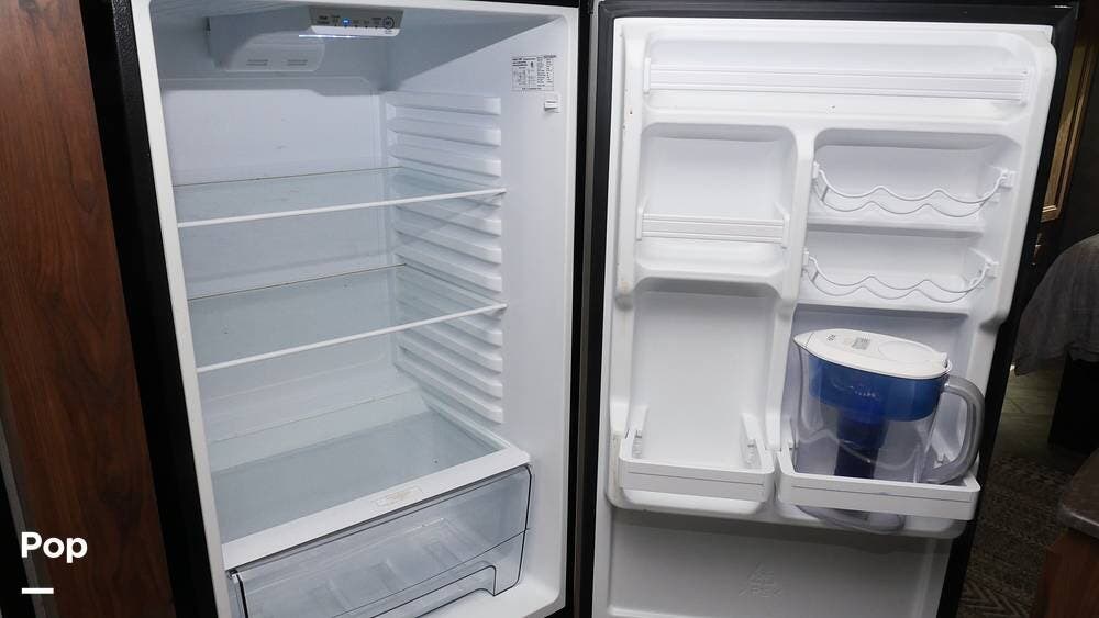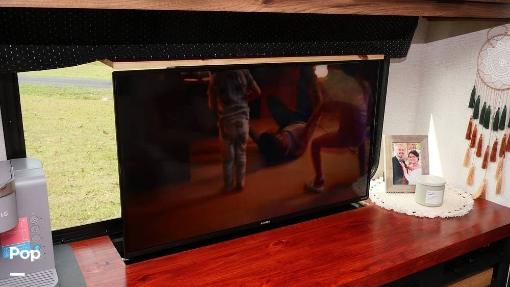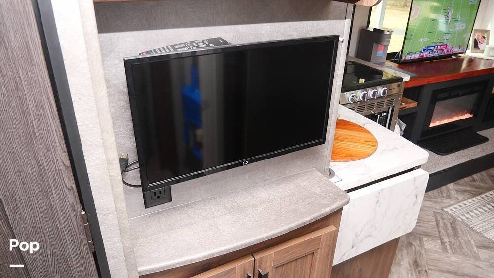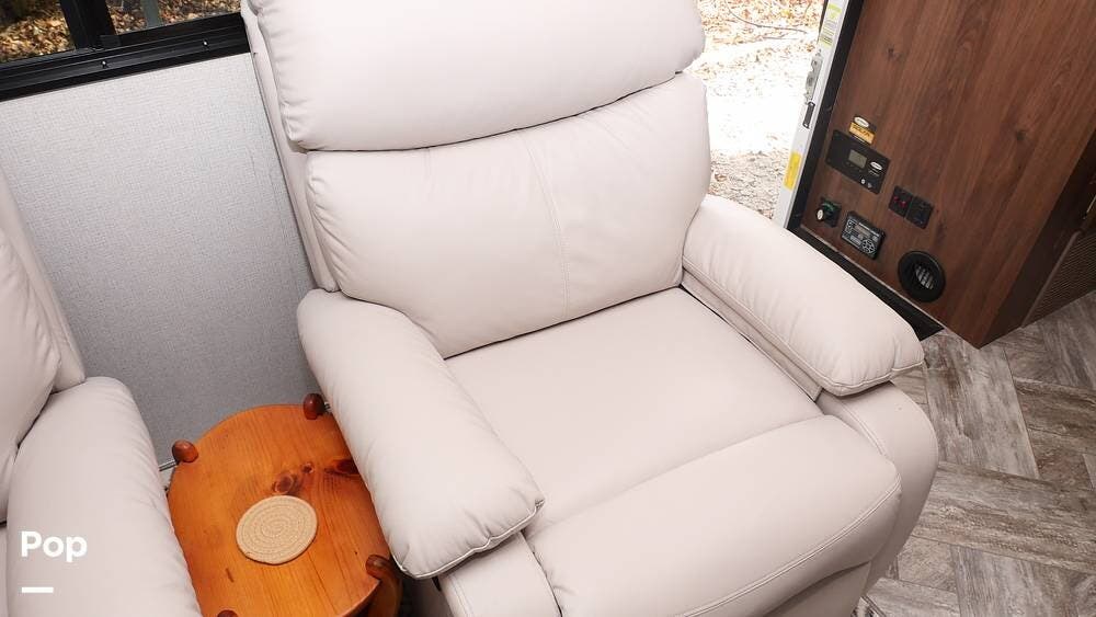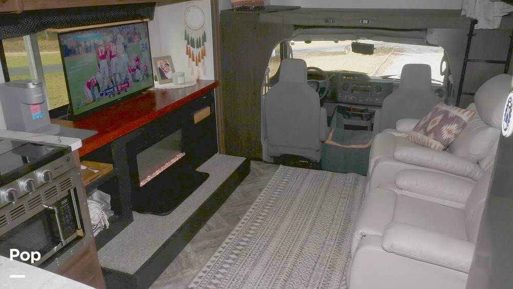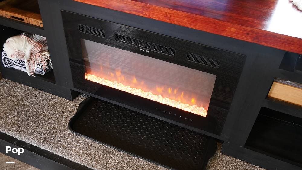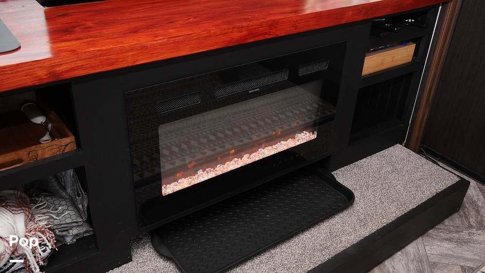 Once you step inside, you'll appreciate the carefully redesigned living area. The generous layout features a cabover bunk, two plush leather recliners, a fireplace with a televator, and a workspace for those who need to work while traveling.