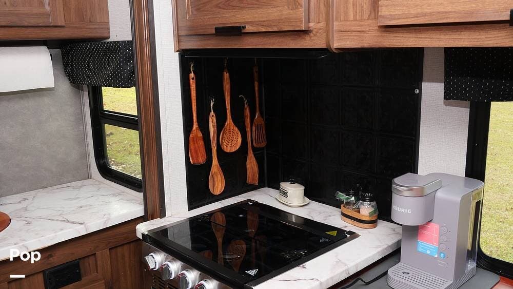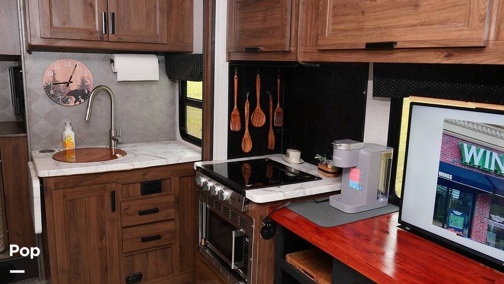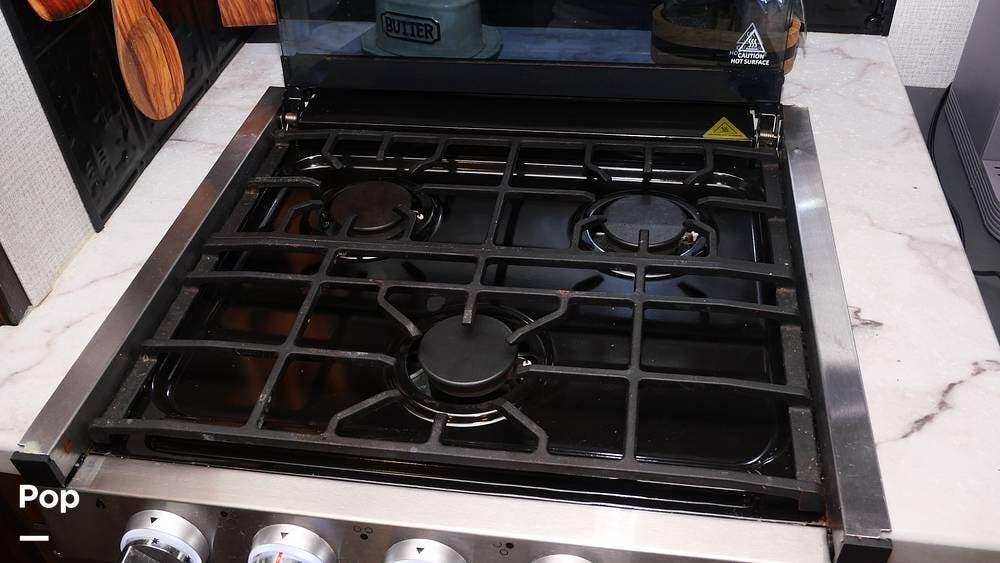 The kitchen is fully equipped for long journeys, featuring a large stainless-steel sink, refrigerator/freezer, microwave, three-burner gas cooktop, oven, and ample storage in cabinets. Every aspect is crafted to ensure road life is as convenient as possible.