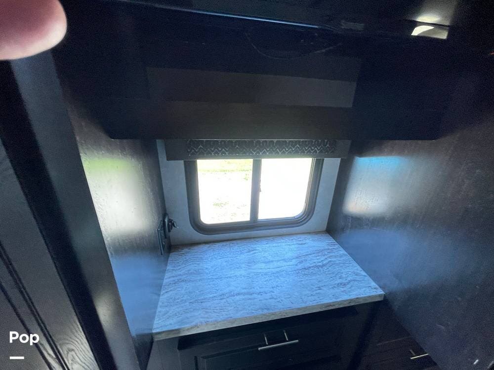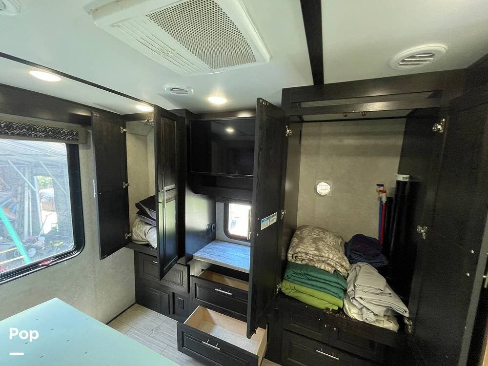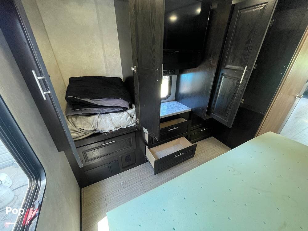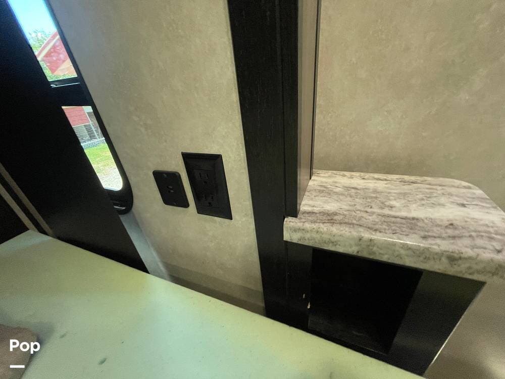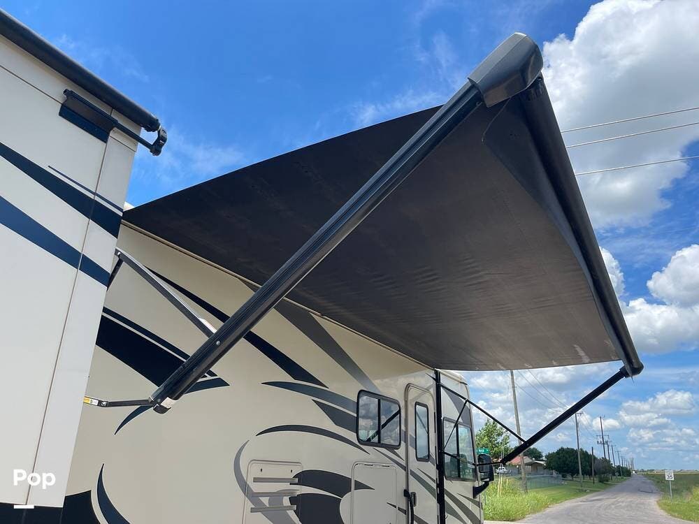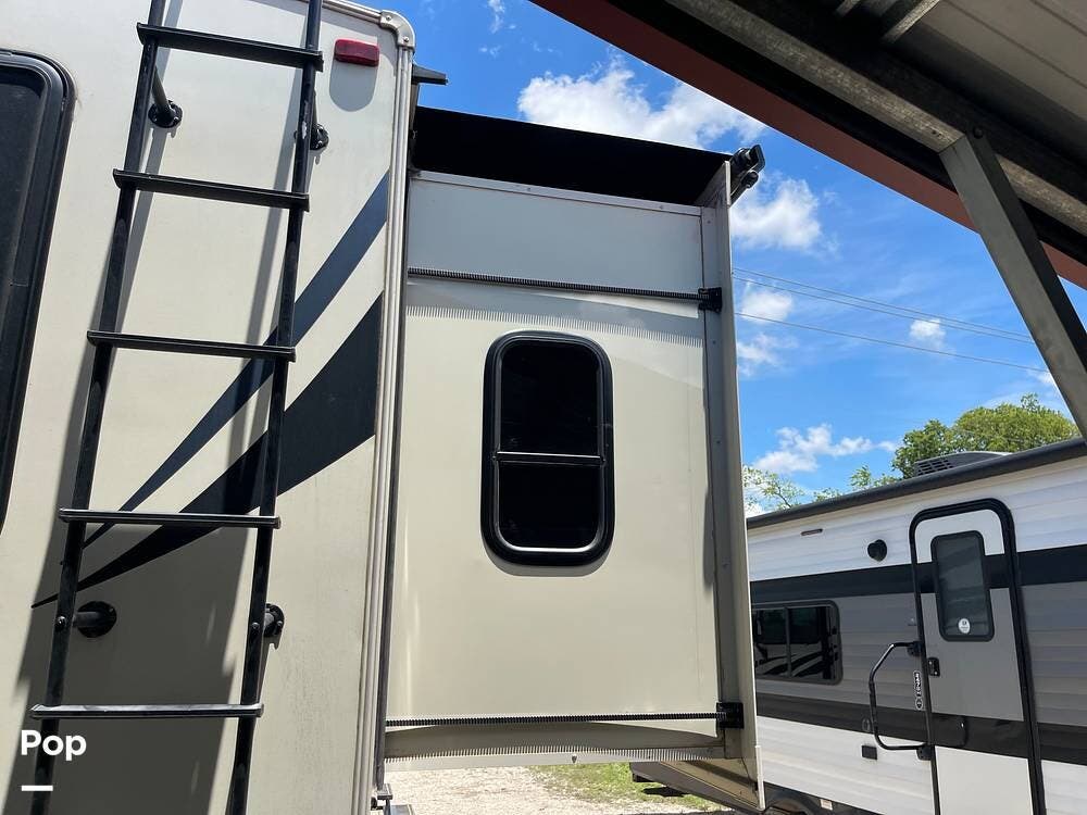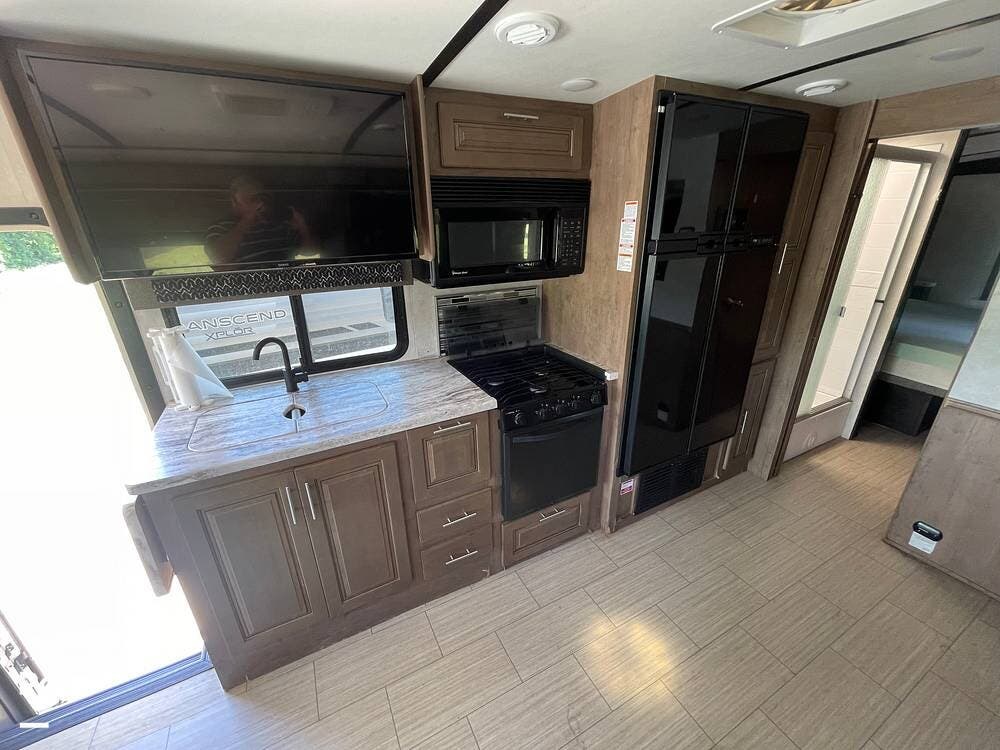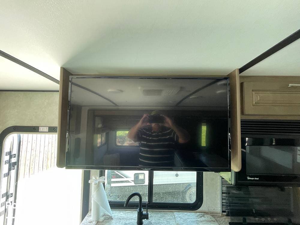 This unit features three flat-screen TVs, with one located on the exterior and equipped with a 17-foot power awning, perfect for enjoying a great evening meal with family and friends while watching a game or movie.